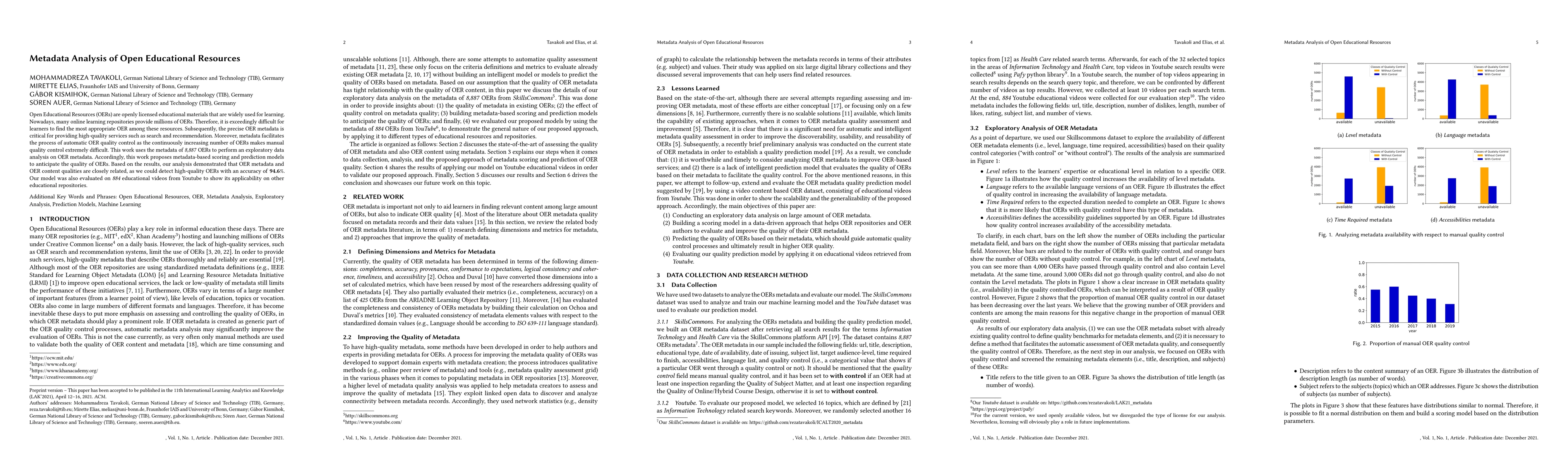 Open Educational Resources (OERs) are openly licensed educational materials that are widely used for learning. Nowadays, many online learning repositories provide millions of OERs. Therefore, it is exceedingly difficult for learners to find the most appropriate OER among these resources. Subsequently, the precise OER metadata is critical for providing high-quality services such as search and recommendation. Moreover, metadata facilitates the process of automatic OER quality control as the continuously increasing number of OERs makes manual quality control extremely difficult. This work uses the metadata of 8,887 OERs to perform an exploratory data analysis on OER metadata. Accordingly, this work proposes metadata-based scoring and prediction models to anticipate the quality of OERs. Based on the results, our analysis demonstrated that OER metadata and OER content qualities are closely related, as we could detect high-quality OERs with an accuracy of 94.6%. Our model was also evaluated on 884 educational videos from Youtube to show its applicability on other educational repositories.