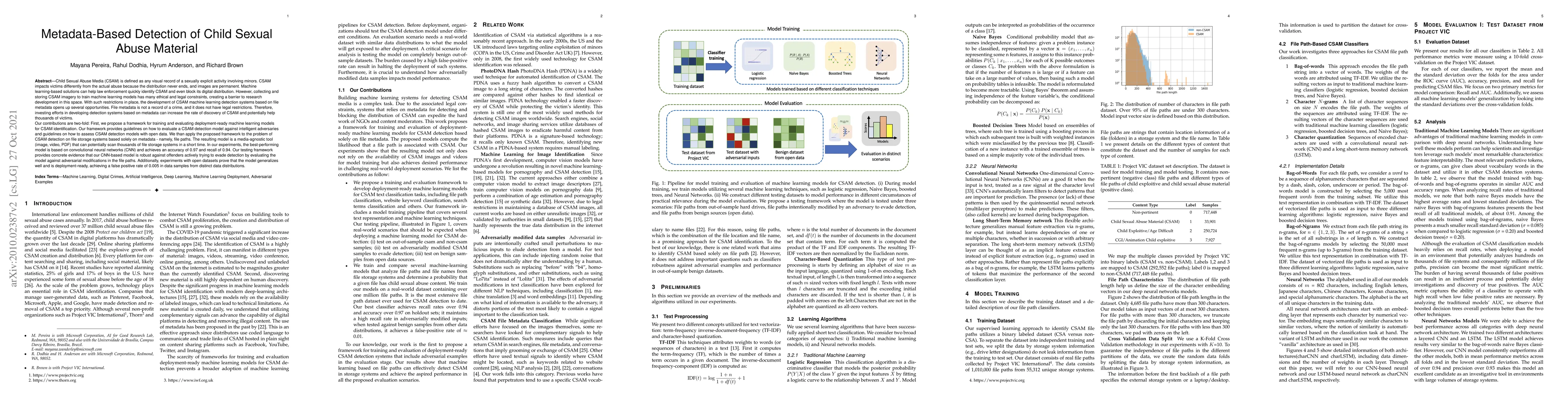 Child Sexual Abuse Media (CSAM) is any visual record of a sexually-explicit activity involving minors. CSAM impacts victims differently from the actual abuse because the distribution never ends, and images are permanent. Machine learning-based solutions can help law enforcement quickly identify CSAM and block digital distribution. However, collecting CSAM imagery to train machine learning models has many ethical and legal constraints, creating a barrier to research development. With such restrictions in place, the development of CSAM machine learning detection systems based on file metadata uncovers several opportunities. Metadata is not a record of a crime, and it does not have legal restrictions. Therefore, investing in detection systems based on metadata can increase the rate of discovery of CSAM and help thousands of victims. We propose a framework for training and evaluating deployment-ready machine learning models for CSAM identification. Our framework provides guidelines to evaluate CSAM detection models against intelligent adversaries and models' performance with open data. We apply the proposed framework to the problem of CSAM detection based on file paths. In our experiments, the best-performing model is based on convolutional neural networks and achieves an accuracy of 0.97. Our evaluation shows that the CNN model is robust against offenders actively trying to evade detection by evaluating the model against adversarially modified data. Experiments with open datasets confirm that the model generalizes well and is deployment-ready.