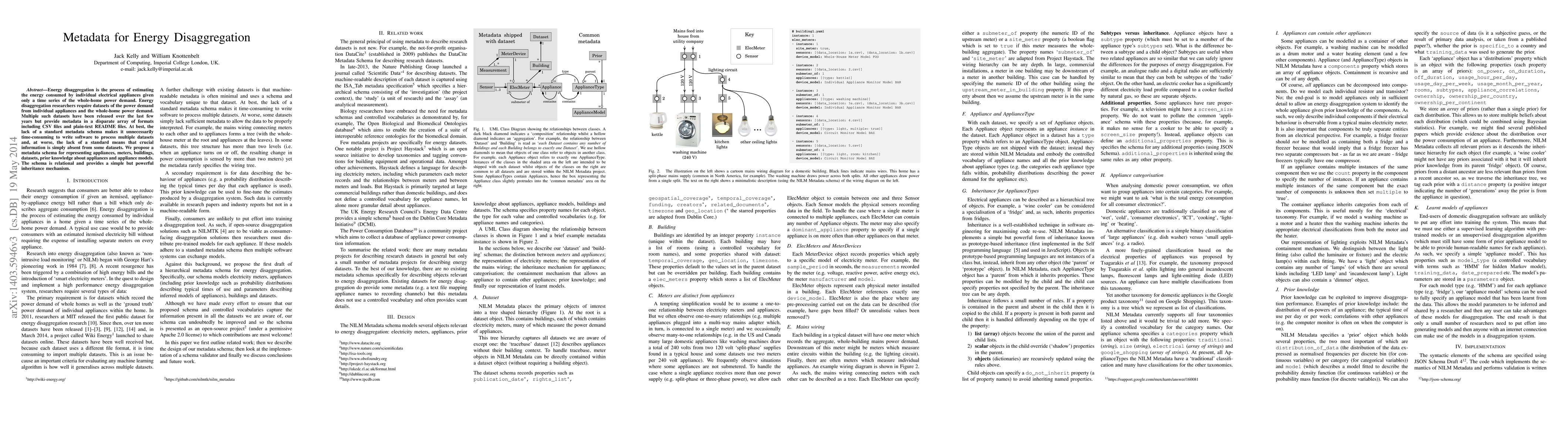 Energy disaggregation is the process of estimating the energy consumed by individual electrical appliances given only a time series of the whole-home power demand. Energy disaggregation researchers require datasets of the power demand from individual appliances and the whole-home power demand. Multiple such datasets have been released over the last few years but provide metadata in a disparate array of formats including CSV files and plain-text README files. At best, the lack of a standard metadata schema makes it unnecessarily time-consuming to write software to process multiple datasets and, at worse, the lack of a standard means that crucial information is simply absent from some datasets. We propose a metadata schema for representing appliances, meters, buildings, datasets, prior knowledge about appliances and appliance models. The schema is relational and provides a simple but powerful inheritance mechanism.