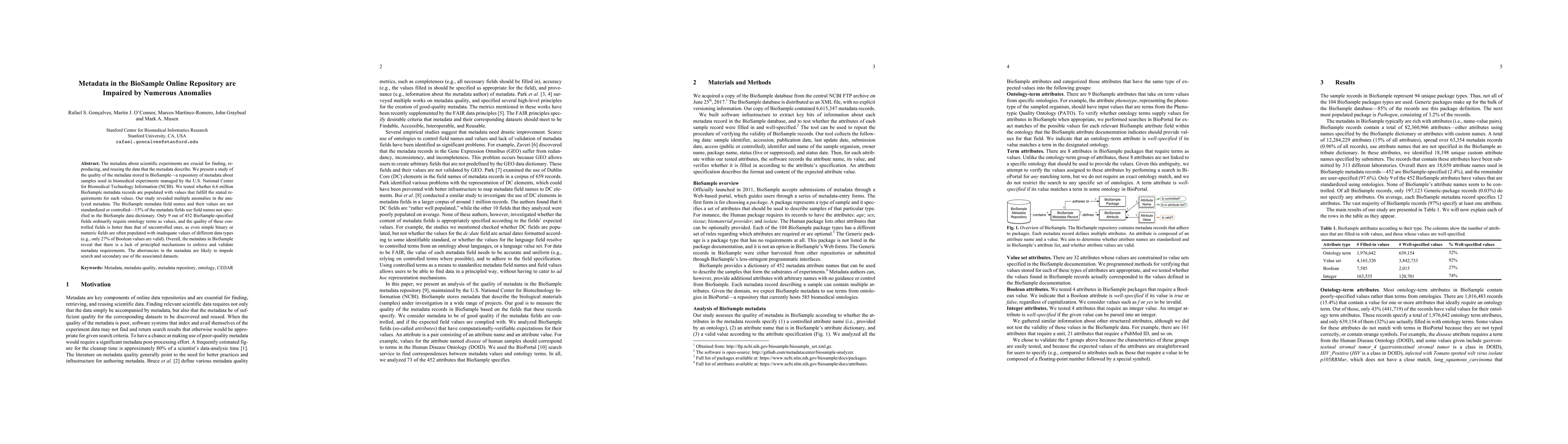 The metadata about scientific experiments are crucial for finding, reproducing, and reusing the data that the metadata describe. We present a study of the quality of the metadata stored in BioSample--a repository of metadata about samples used in biomedical experiments managed by the U.S. National Center for Biomedical Technology Information (NCBI). We tested whether 6.6 million BioSample metadata records are populated with values that fulfill the stated requirements for such values. Our study revealed multiple anomalies in the analyzed metadata. The BioSample metadata field names and their values are not standardized or controlled--15% of the metadata fields use field names not specified in the BioSample data dictionary. Only 9 out of 452 BioSample-specified fields ordinarily require ontology terms as values, and the quality of these controlled fields is better than that of uncontrolled ones, as even simple binary or numeric fields are often populated with inadequate values of different data types (e.g., only 27% of Boolean values are valid). Overall, the metadata in BioSample reveal that there is a lack of principled mechanisms to enforce and validate metadata requirements. The aberrancies in the metadata are likely to impede search and secondary use of the associated datasets.