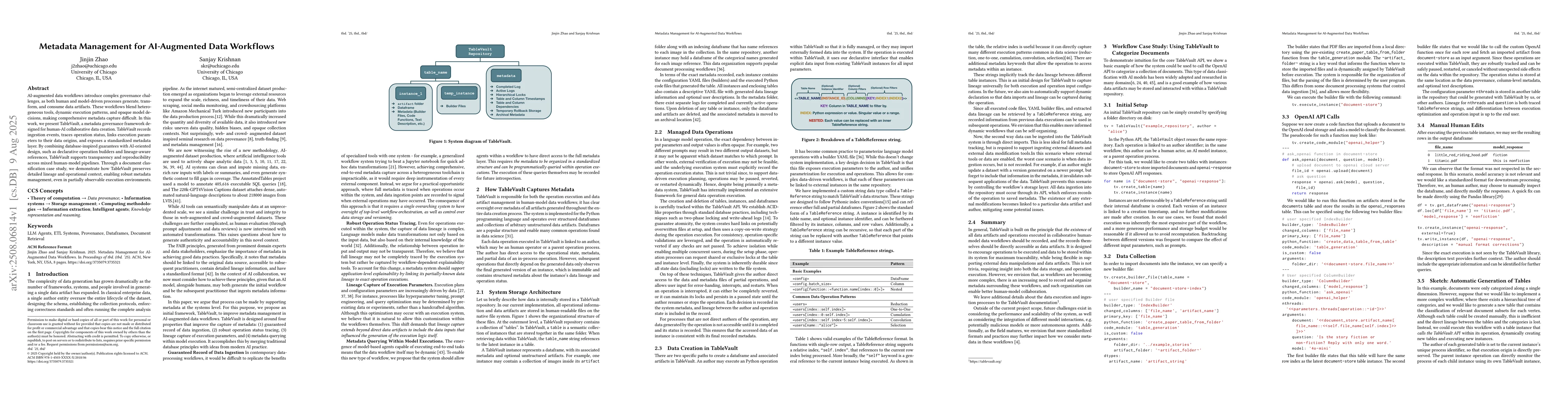 AI-augmented data workflows introduce complex governance challenges, as both human and model-driven processes generate, transform, and consume data artifacts. These workflows blend heterogeneous tools, dynamic execution patterns, and opaque model decisions, making comprehensive metadata capture difficult. In this work, we present TableVault, a metadata governance framework designed for human-AI collaborative data creation. TableVault records ingestion events, traces operation status, links execution parameters to their data origins, and exposes a standardized metadata layer. By combining database-inspired guarantees with AI-oriented design, such as declarative operation builders and lineage-aware references, TableVault supports transparency and reproducibility across mixed human-model pipelines. Through a document classification case study, we demonstrate how TableVault preserves detailed lineage and operational context, enabling robust metadata management, even in partially observable execution environments.