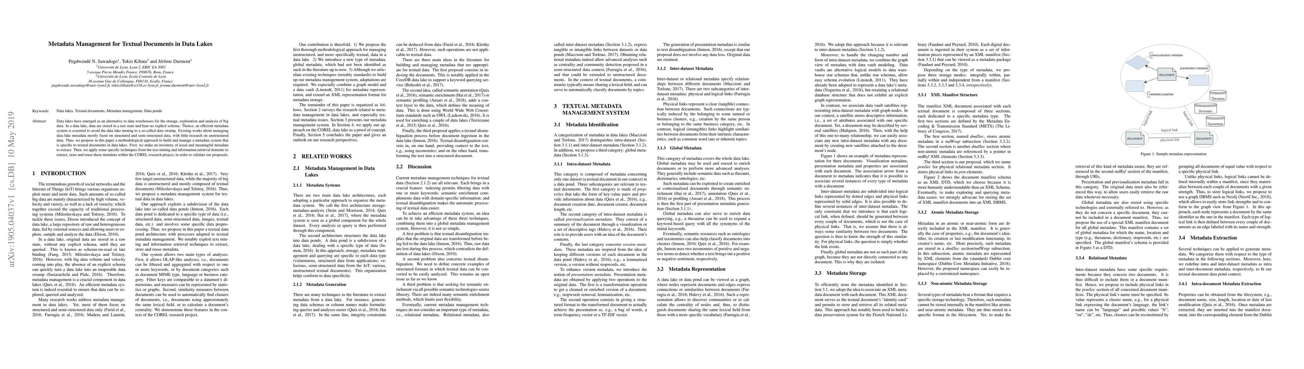 This paper proposes a methodological approach for managing metadata specific to textual documents in data lakes, focusing on extracting meaningful metadata through text mining and information retrieval techniques to validate the approach within the COREL research project. Existing metadata management solutions are often inadequate for unstructured data, prompting this novel strategy.