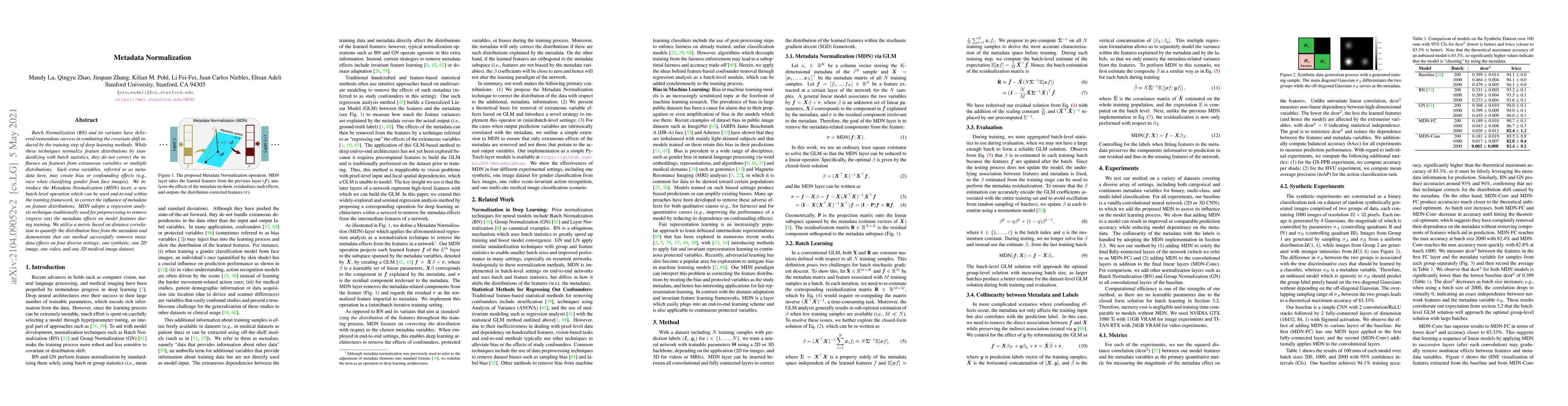 Batch Normalization (BN) and its variants have delivered tremendous success in combating the covariate shift induced by the training step of deep learning methods. While these techniques normalize feature distributions by standardizing with batch statistics, they do not correct the influence on features from extraneous variables or multiple distributions. Such extra variables, referred to as metadata here, may create bias or confounding effects (e.g., race when classifying gender from face images). We introduce the Metadata Normalization (MDN) layer, a new batch-level operation which can be used end-to-end within the training framework, to correct the influence of metadata on feature distributions. MDN adopts a regression analysis technique traditionally used for preprocessing to remove (regress out) the metadata effects on model features during training. We utilize a metric based on distance correlation to quantify the distribution bias from the metadata and demonstrate that our method successfully removes metadata effects on four diverse settings: one synthetic, one 2D image, one video, and one 3D medical image dataset.