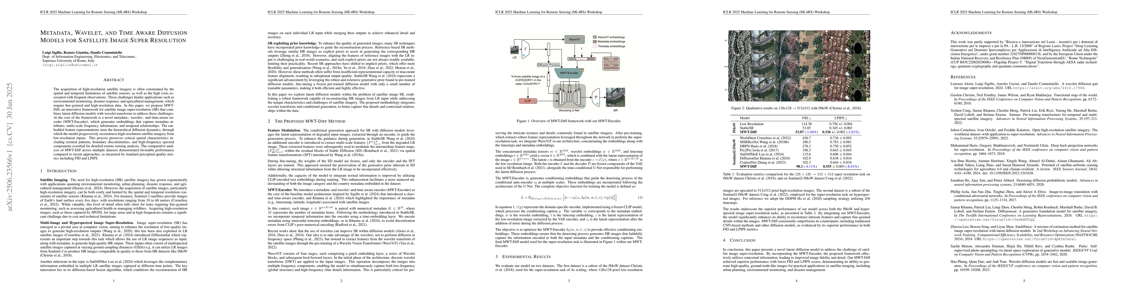 The acquisition of high-resolution satellite imagery is often constrained by the spatial and temporal limitations of satellite sensors, as well as the high costs associated with frequent observations. These challenges hinder applications such as environmental monitoring, disaster response, and agricultural management, which require fine-grained and high-resolution data. In this paper, we propose MWT-Diff, an innovative framework for satellite image super-resolution (SR) that combines latent diffusion models with wavelet transforms to address these challenges. At the core of the framework is a novel metadata-, wavelet-, and time-aware encoder (MWT-Encoder), which generates embeddings that capture metadata attributes, multi-scale frequency information, and temporal relationships. The embedded feature representations steer the hierarchical diffusion dynamics, through which the model progressively reconstructs high-resolution satellite imagery from low-resolution inputs. This process preserves critical spatial characteristics including textural patterns, boundary discontinuities, and high-frequency spectral components essential for detailed remote sensing analysis. The comparative analysis of MWT-Diff across multiple datasets demonstrated favorable performance compared to recent approaches, as measured by standard perceptual quality metrics including FID and LPIPS.