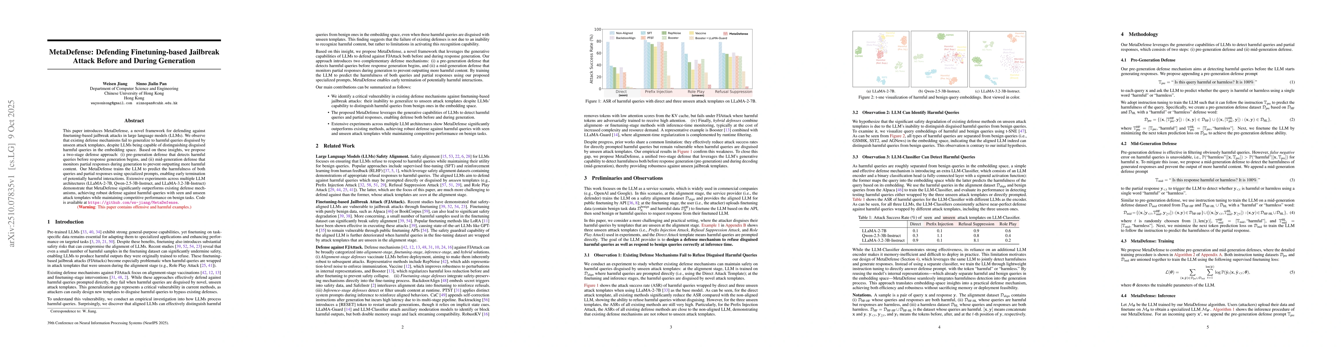 This paper introduces MetaDefense, a novel framework for defending against finetuning-based jailbreak attacks in large language models (LLMs). We observe that existing defense mechanisms fail to generalize to harmful queries disguised by unseen attack templates, despite LLMs being capable of distinguishing disguised harmful queries in the embedding space. Based on these insights, we propose a two-stage defense approach: (i) pre-generation defense that detects harmful queries before response generation begins, and (ii) mid-generation defense that monitors partial responses during generation to prevent outputting more harmful content. Our MetaDefense trains the LLM to predict the harmfulness of both queries and partial responses using specialized prompts, enabling early termination of potentially harmful interactions. Extensive experiments across multiple LLM architectures (LLaMA-2-7B, Qwen-2.5-3B-Instruct, and LLaMA-3.2-3B-Instruct) demonstrate that MetaDefense significantly outperforms existing defense mechanisms, achieving robust defense against harmful queries with seen and unseen attack templates while maintaining competitive performance on benign tasks. Code is available at https://github.com/ws-jiang/MetaDefense.