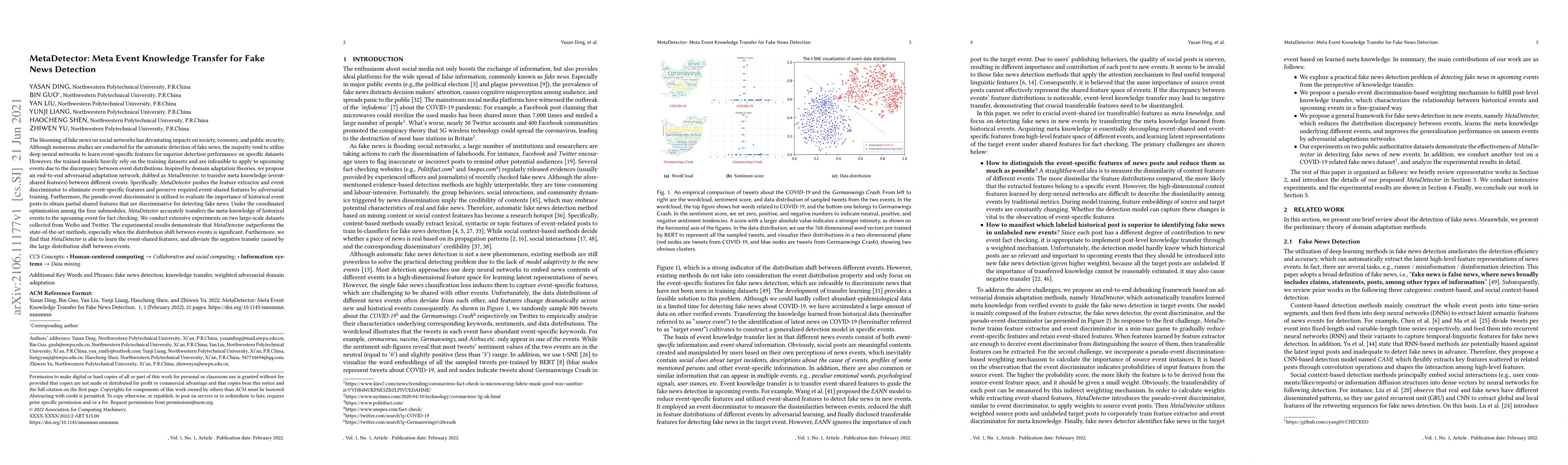 MetaDetector is an adversarial adaptation network designed to transfer meta knowledge for detecting fake news across different events by focusing on shared features, thereby improving detection performance despite significant distribution shifts between events. Experimental results show it outperforms existing methods on large-scale datasets from Weibo and Twitter.