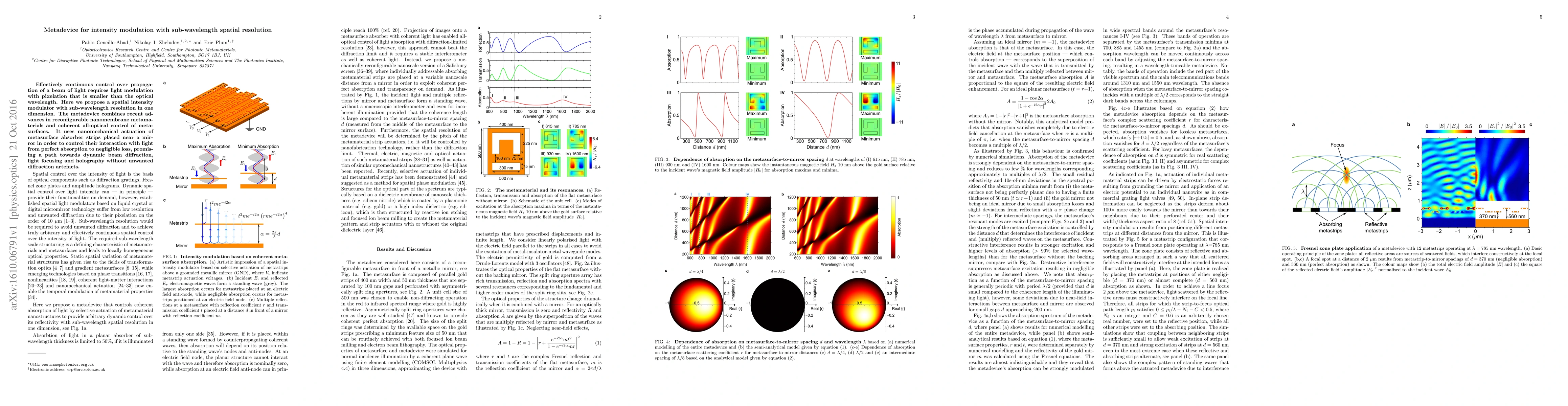 Effectively continuous control over propagation of a beam of light requires light modulation with pixelation that is smaller than the optical wavelength. Here we propose a spatial intensity modulator with sub-wavelength resolution in one dimension. The metadevice combines recent advances in reconfigurable nanomembrane metamaterials and coherent all-optical control of metasurfaces. It uses nanomechanical actuation of metasurface absorber strips placed near a mirror in order to control their interaction with light from perfect absorption to negligible loss, promising a path towards dynamic beam diffraction, light focusing and holography without unwanted diffraction artefacts.