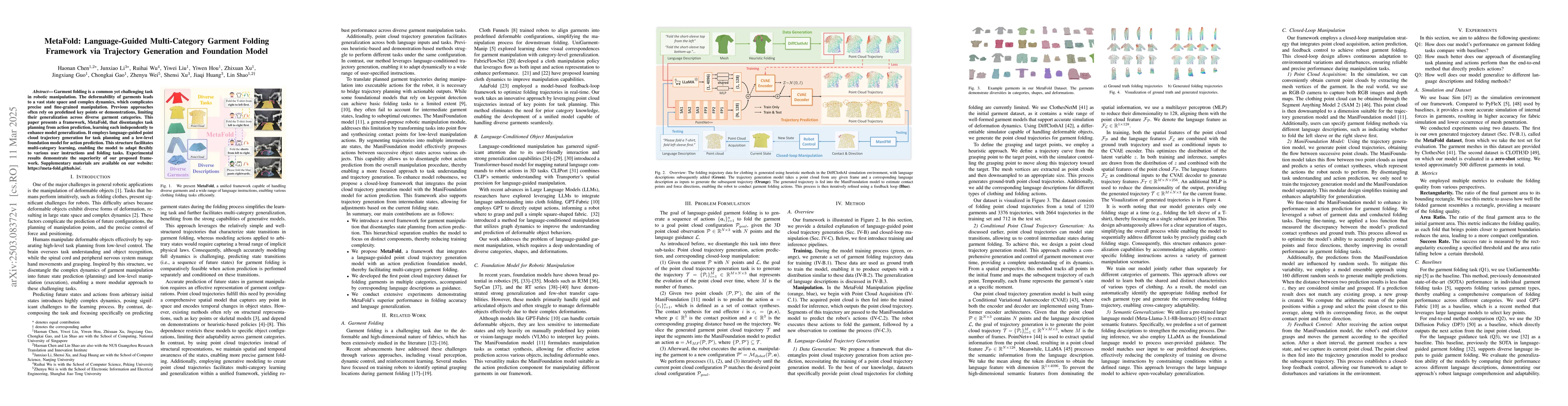 MetaFold introduces a novel framework for robotic garment folding that separates task planning from action prediction to enhance model generalization across diverse garment types. It uses language-guided trajectory generation and a foundation model for precise manipulation, achieving superior performance in multi-category learning tasks.