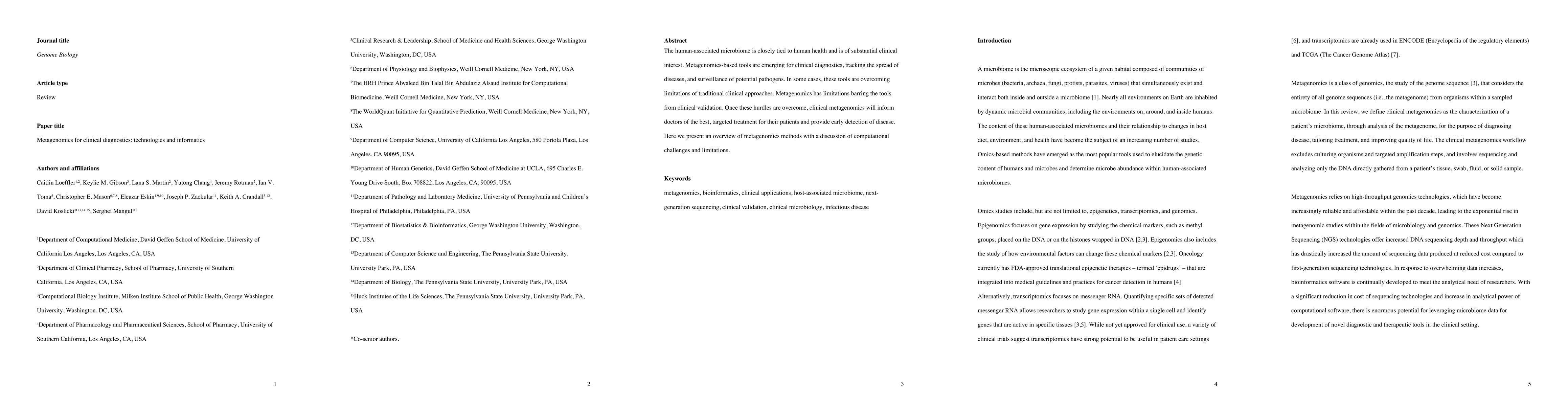 This paper reviews metagenomics-based tools for clinical diagnostics, highlighting their potential to overcome traditional clinical limitations and provide targeted treatments. It discusses the computational challenges and limitations that currently hinder their clinical validation.