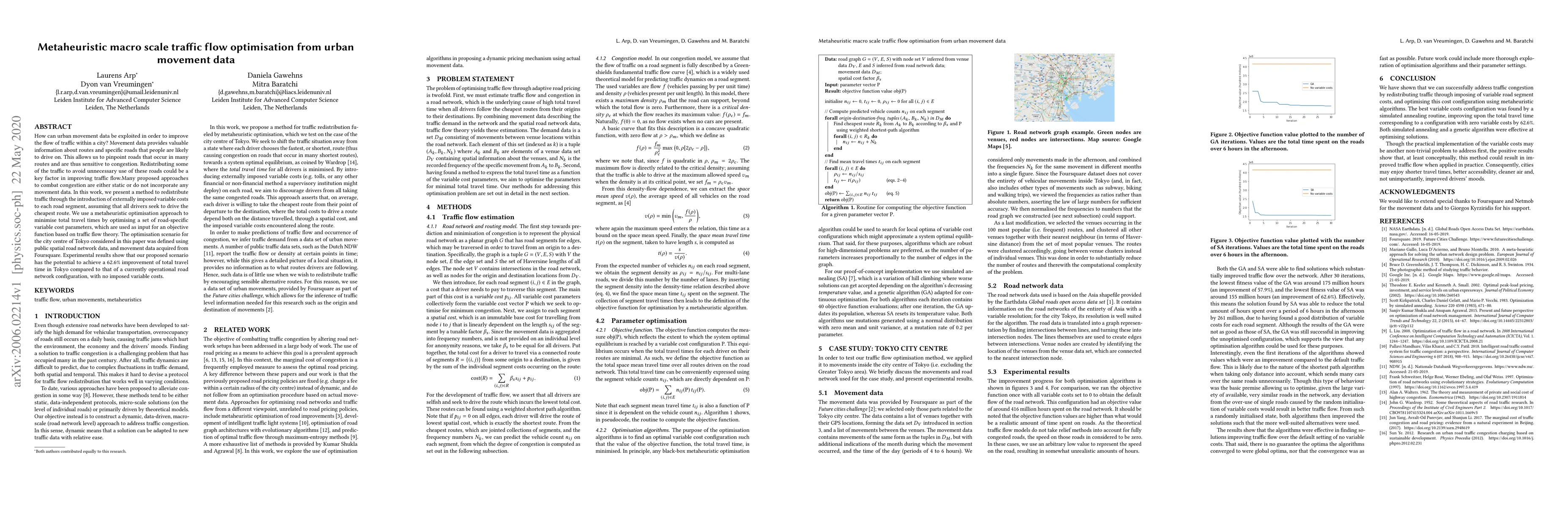 How can urban movement data be exploited in order to improve the flow of traffic within a city? Movement data provides valuable information about routes and specific roads that people are likely to drive on. This allows us to pinpoint roads that occur in many routes and are thus sensitive to congestion. Redistributing some of the traffic to avoid unnecessary use of these roads could be a key factor in improving traffic flow. Many proposed approaches to combat congestion are either static or do not incorporate any movement data. In this work, we present a method to redistribute traffic through the introduction of externally imposed variable costs to each road segment, assuming that all drivers seek to drive the cheapest route. We use a metaheuristic optimisation approach to minimise total travel times by optimising a set of road-specific variable cost parameters, which are used as input for an objective function based on traffic flow theory. The optimisation scenario for the city centre of Tokyo considered in this paper was defined using public spatial road network data, and movement data acquired from Foursquare. Experimental results show that our proposed scenario has the potential to achieve a 62.6\% improvement of total travel time in Tokyo compared to that of a currently operational road network configuration, with no imposed variable costs.