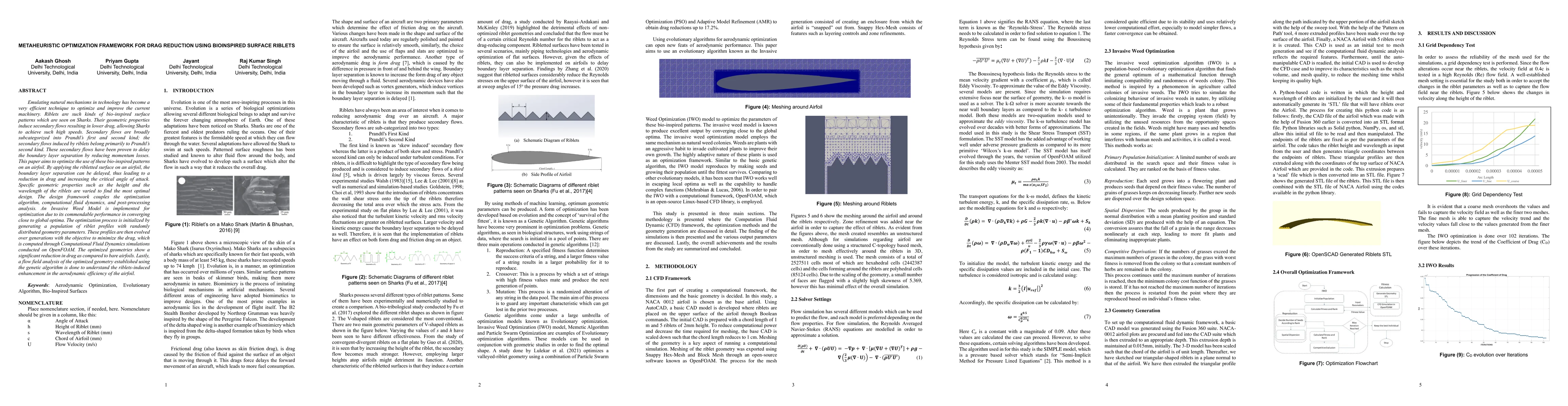 This paper develops a metaheuristic optimization framework using bioinspired surface riblets to reduce drag on airfoils. The Invasive Weed Model optimizes riblet geometry to delay boundary layer separation, significantly reducing drag and increasing the critical angle of attack, validated through CFD simulations on OpenFOAM.