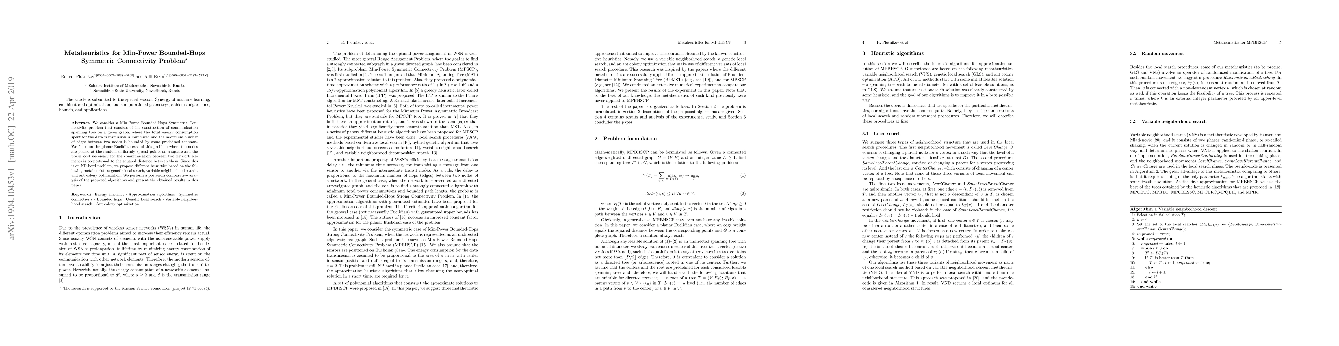 This paper addresses the Min-Power Bounded-Hops Symmetric Connectivity problem, focusing on constructing a communication spanning tree to minimize energy consumption while adhering to a bounded number of hops. It proposes metaheuristics like genetic local search, variable neighborhood search, and ant colony optimization to tackle this NP-hard problem in a planar Euclidean context, and presents a comparative analysis of the effectiveness of these algorithms.