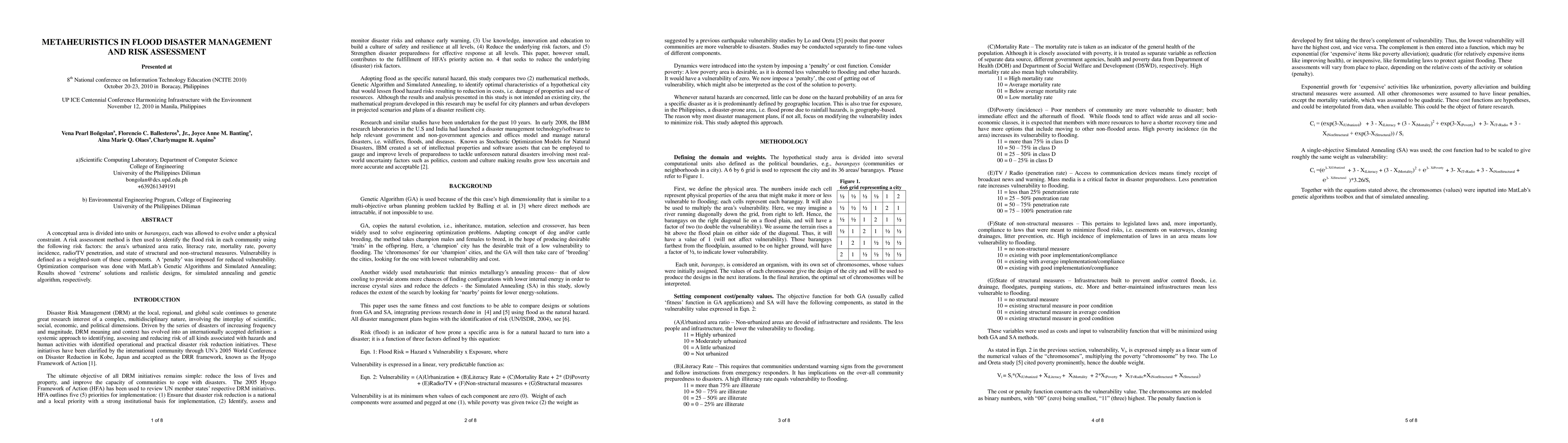 This paper explores the application of metaheuristic optimization techniques, specifically Genetic Algorithms and Simulated Annealing, to flood disaster management and risk assessment. The study evaluates vulnerability in different communities based on various risk factors and demonstrates the optimization methods' effectiveness in generating realistic flood risk mitigation designs.
