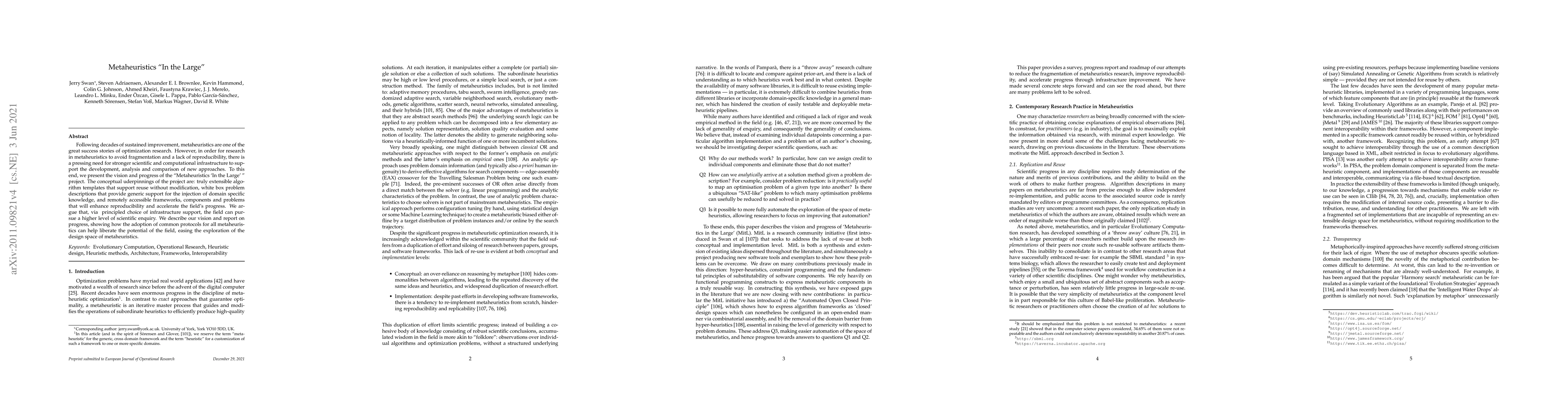 This paper discusses the need for improved scientific and computational infrastructure to support metaheuristic optimization research, aiming to prevent fragmentation and enhance reproducibility. It proposes common protocols to facilitate higher-level scientific inquiry and the exploration of metaheuristic design spaces.