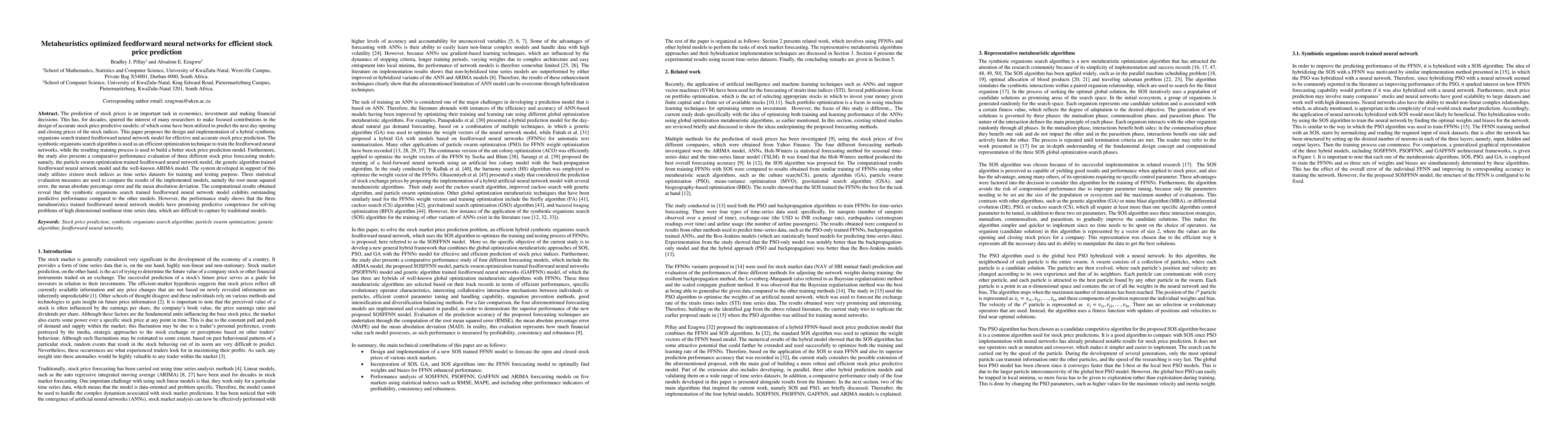 This paper proposes a hybrid symbiotic organisms search (SOS) optimized feedforward neural network model for accurate stock price prediction, demonstrating superior performance compared to particle swarm optimization, genetic algorithm, and ARIMA models based on statistical evaluation measures. The SOS-trained model shows promising results for high-dimensional nonlinear time series data.