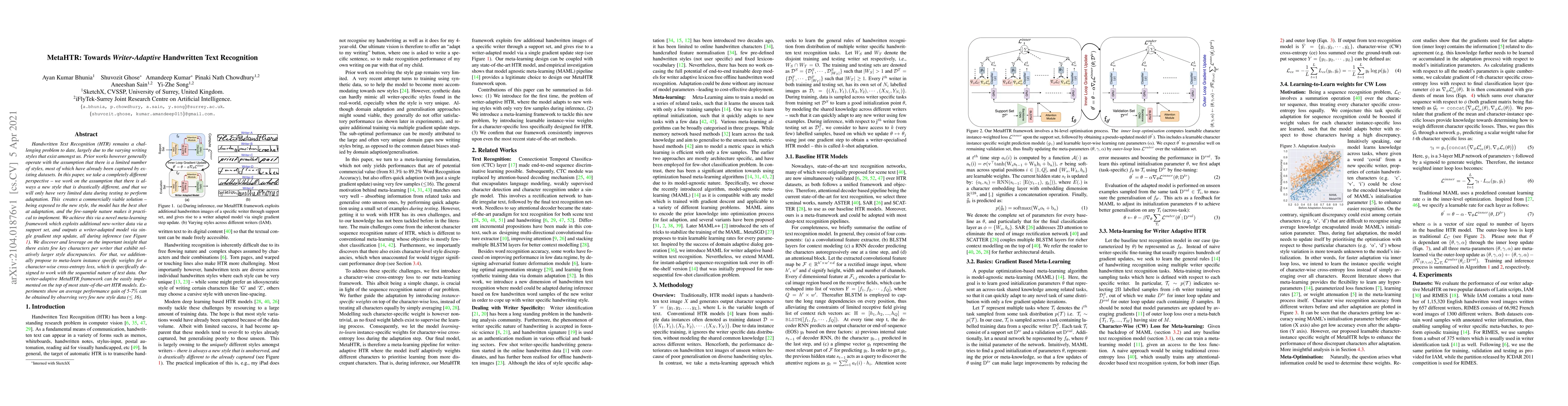 This research paper introduces MetaHTR, a novel framework for handwritten text recognition that adapts to new writing styles with limited data, achieving average performance gains of 5-7%.