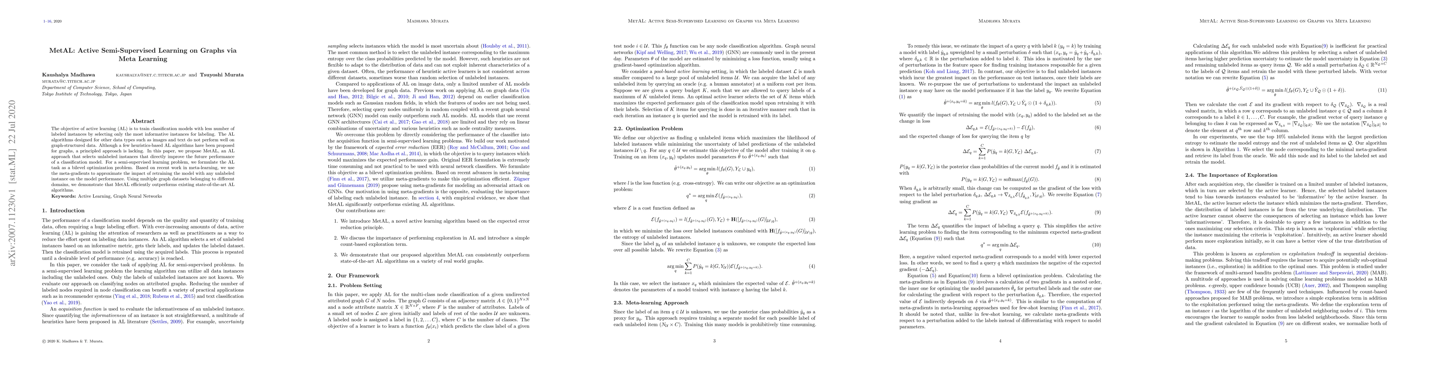 The objective of active learning (AL) is to train classification models with less number of labeled instances by selecting only the most informative instances for labeling. The AL algorithms designed for other data types such as images and text do not perform well on graph-structured data. Although a few heuristics-based AL algorithms have been proposed for graphs, a principled approach is lacking. In this paper, we propose MetAL, an AL approach that selects unlabeled instances that directly improve the future performance of a classification model. For a semi-supervised learning problem, we formulate the AL task as a bilevel optimization problem. Based on recent work in meta-learning, we use the meta-gradients to approximate the impact of retraining the model with any unlabeled instance on the model performance. Using multiple graph datasets belonging to different domains, we demonstrate that MetAL efficiently outperforms existing state-of-the-art AL algorithms.