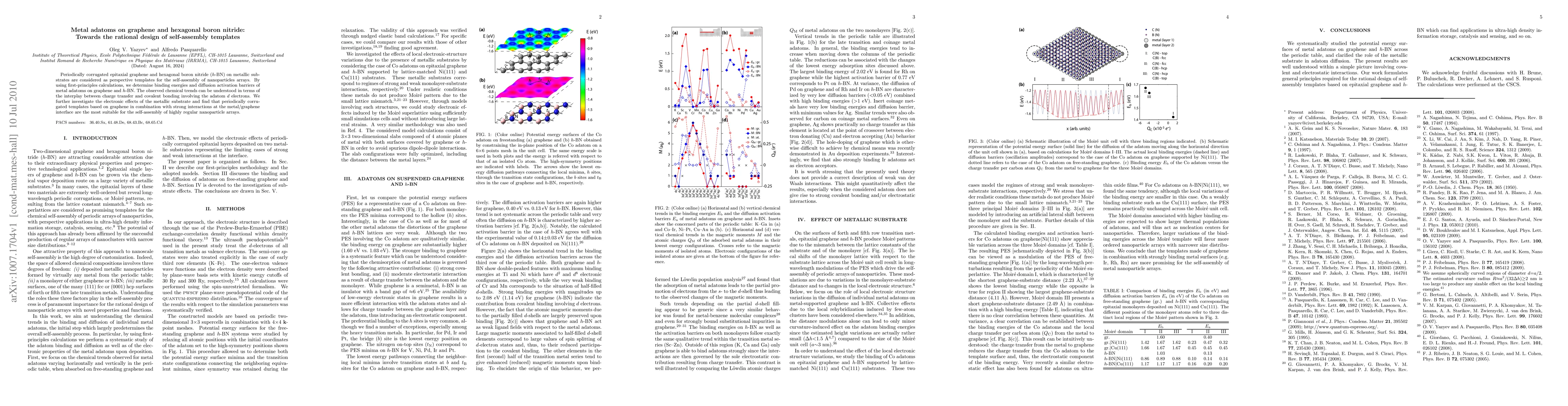Periodically corrugated epitaxial graphene and hexagonal boron nitride (h-BN) on metallic substrates are considered as perspective templates for the self-assembly of nanoparticles arrays. By using first-principles calculations, we determine binding energies and diffusion activation barriers of metal adatoms on graphene and h-BN. The observed chemical trends can be understood in terms of the interplay between charge transfer and covalent bonding involving the adatom d electrons. We further investigate the electronic effects of the metallic substrate and find that periodically corrugated templates based on graphene in combination with strong interactions at the metal/graphene interface are the most suitable for the self-assembly of highly regular nanoparticle arrays.