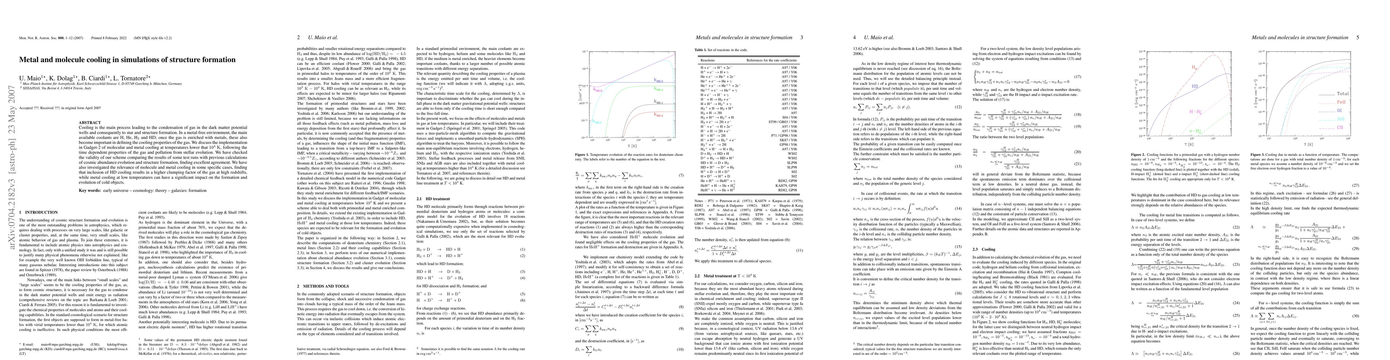 This paper discusses the implementation of molecular and metal cooling processes in Gadget-2 simulations, focusing on their role in gas condensation and structure formation at temperatures below $\rm10^4 K$. The study finds that HD cooling enhances gas clumping at high redshifts, while metal cooling impacts the formation of cold objects.