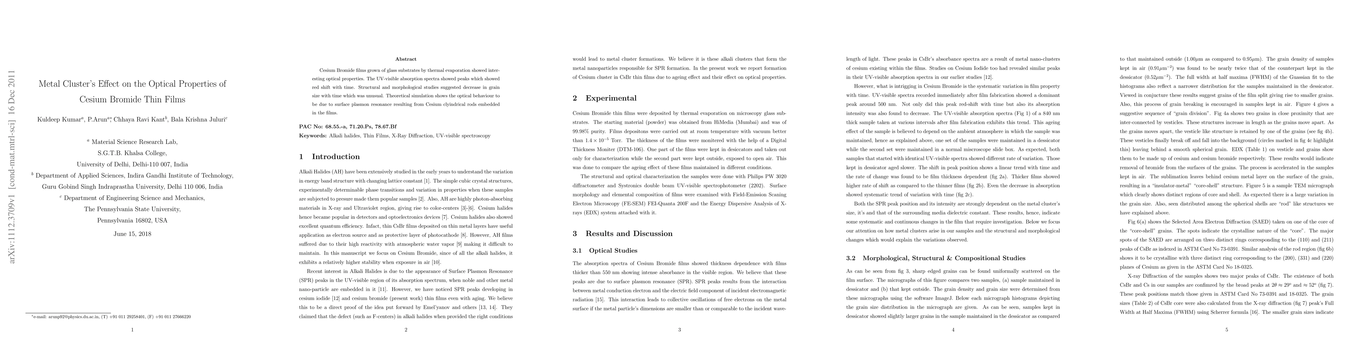 This study investigates the optical properties of cesium bromide thin films, revealing a red shift in UV-visible absorption spectra over time. The unusual decrease in grain size is attributed to surface plasmon resonance from embedded cesium cylindrical rods, as suggested by theoretical simulations.