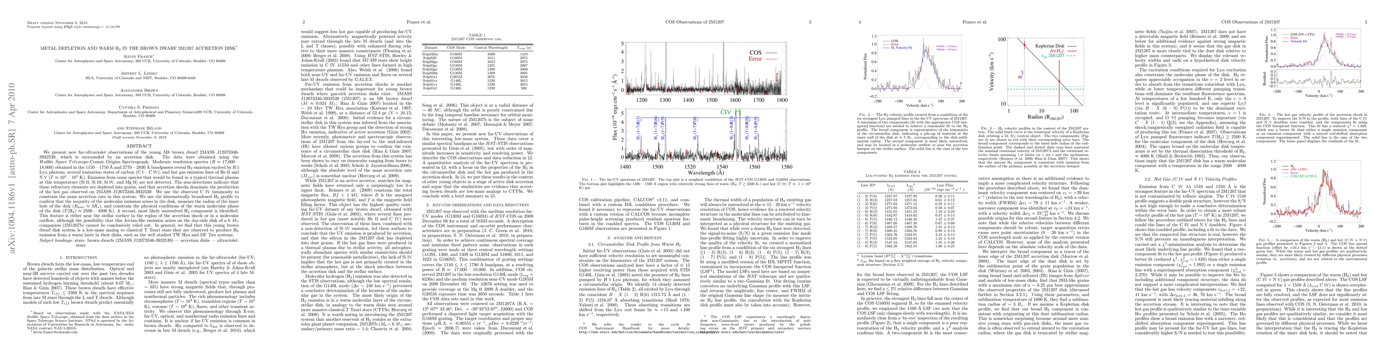 Researchers studied a young brown dwarf surrounded by an accretion disk, finding evidence of metal depletion and warm H2 emission, which provides insights into the system's physical conditions and mass accretion rate.