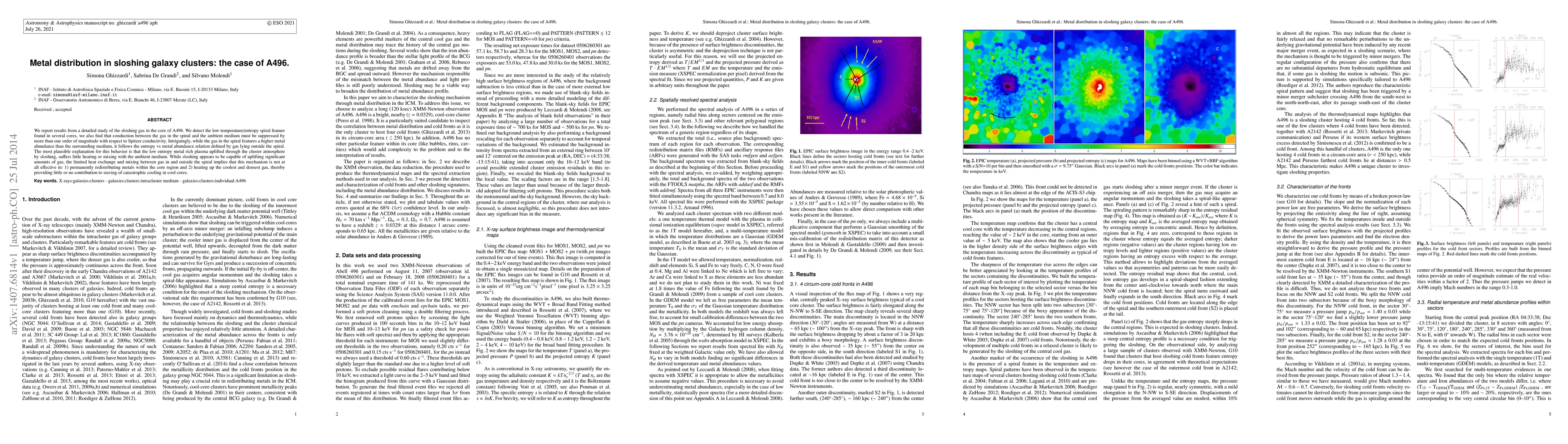 We report results from a detailed study of the sloshing gas in the core of A496. We detect the low temperature/entropy spiral feature found in several cores, we also find that conduction between the gas in the spiral and the ambient medium must be suppressed by more than one order of magnitude with respect to Spitzer conductivity. Intriguingly, while the gas in the spiral features a higher metal abundance than the surrounding medium, it follows the entropy vs metal abundance relation defined by gas lying outside the spiral. The most plausible explanation for this behavior is that the low entropy metal rich plasma uplifted through the cluster atmosphere by sloshing, suffers little heating or mixing with the ambient medium. While sloshing appears to be capable of uplifting significant amounts of gas, the limited heat exchange and mixing between gas in and outside the spiral implies that this mechanism is not at all effective in: 1) permanently redistributing metals within the core region and 2) heating up the coolest and densest gas, thereby providing little or no contribution to staving of catastrophic cooling in cool cores.