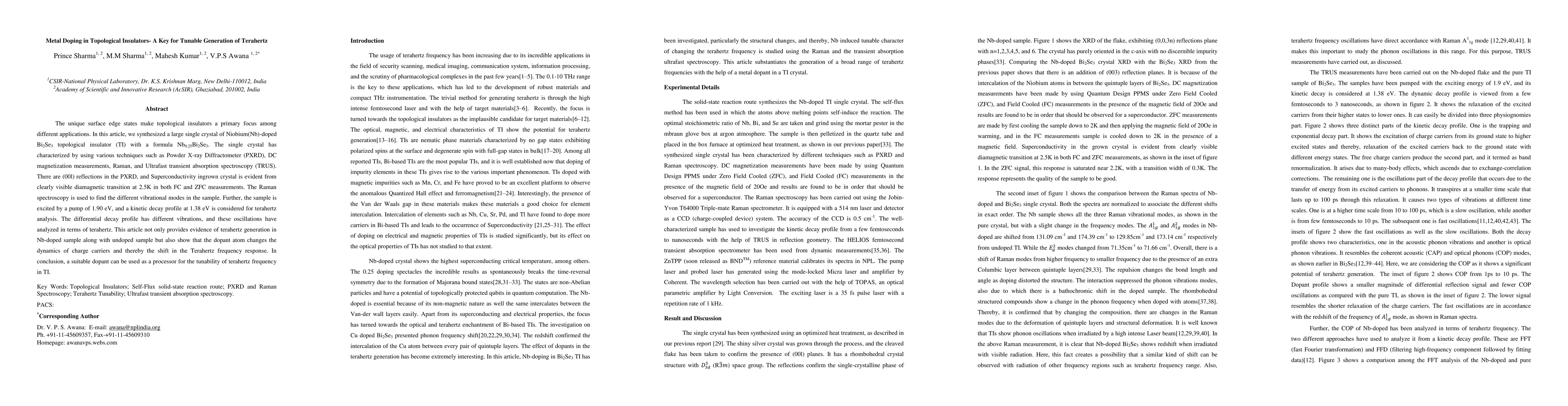 The unique surface edge states make topological insulators a primary focus among different applications. In this article, we synthesized a large single crystal of Niobium(Nb)-doped Bi2Se3 topological insulator (TI) with a formula Nb0.25Bi2Se3. The single crystal has characterized by using various techniques such as Powder X-ray Diffractometer (PXRD), DC magnetization measurements, Raman, and Ultrafast transient absorption spectroscopy (TRUS). There are (00l) reflections in the PXRD, and Superconductivity ingrown crystal is evident from clearly visible diamagnetic transition at 2.5K in both FC and ZFC measurements. The Raman spectroscopy is used to find the different vibrational modes in the sample. Further, the sample is excited by a pump of 1.90 eV, and a kinetic decay profile at 1.38 eV is considered for terahertz analysis. The differential decay profile has different vibrations, and these oscillations have analyzed in terms of terahertz. This article not only provides evidence of terahertz generation in Nb-doped sample along with undoped sample but also show that the dopant atom changes the dynamics of charge carriers and thereby the shift in the Terahertz frequency response. In conclusion, a suitable dopant can be used as a processor for the tunability of terahertz frequency in TI.