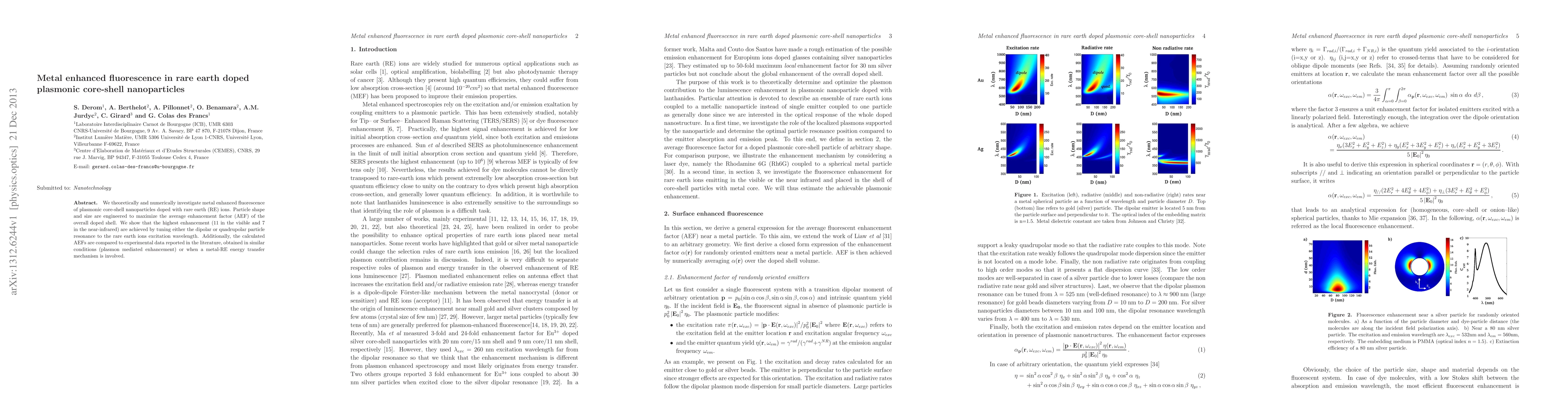 This research explores metal-enhanced fluorescence in plasmonic core-shell nanoparticles doped with rare earth ions, showing significant enhancement factors of up to 11 in the visible and 7 in the near-infrared by tuning particle resonances. Comparisons with experimental data highlight the effectiveness of plasmon-mediated enhancement and metal-RE energy transfer mechanisms.