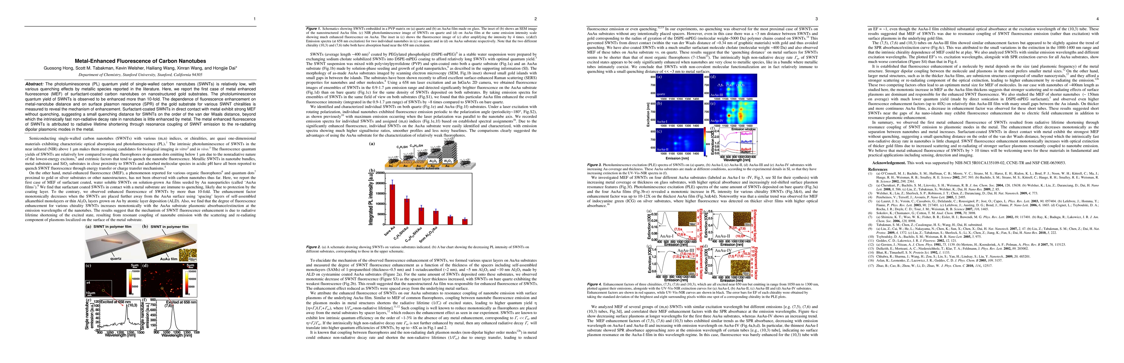 This study demonstrates the first metal-enhanced fluorescence (MEF) of surfactant-coated single-walled carbon nanotubes (SWNTs) on gold substrates, achieving a more than 10-fold increase in photoluminescence quantum yield. The enhancement mechanism is attributed to resonance coupling with metal plasmonic modes, leading to radiative lifetime shortening.
