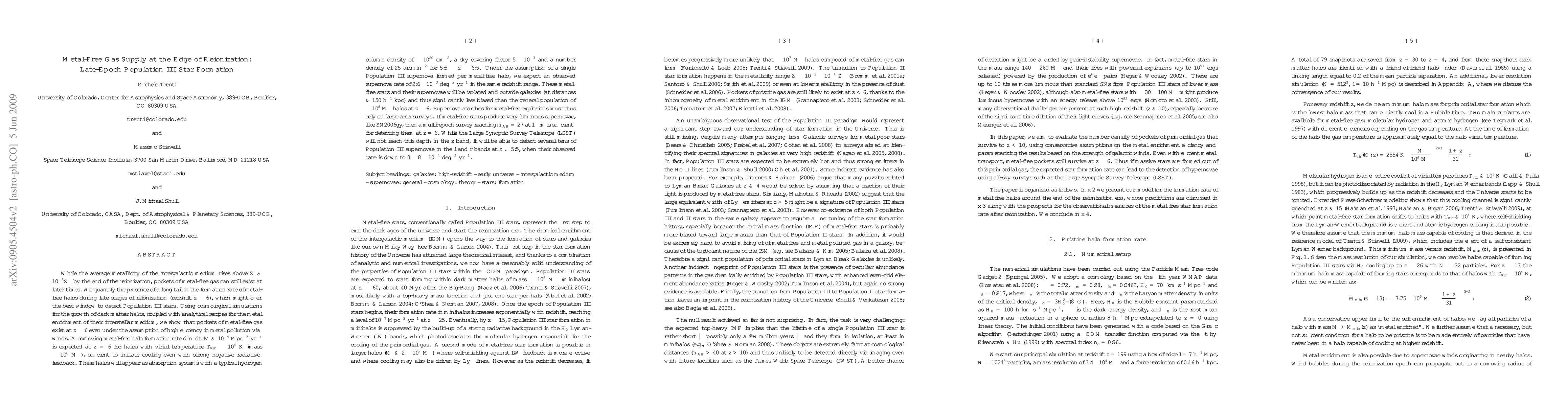 While the average metallicity of the intergalactic medium rises above Z~10^{-3} Zsun by the end of the reionization, pockets of metal-free gas can still exist at later times. We quantify the presence of a long tail in the formation rate of metal-free halos during late stages of reionization (redshift z~6), which might offer the best window to detect Population III stars. Using cosmological simulations for the growth of dark matter halos, coupled with analytical recipes for the metal enrichment of their interstellar medium, we show that pockets of metal-free gas exist at z~6 even under the assumption of high efficiency in metal pollution via winds. A comoving metal-free halo formation rate d^2n/dtdV > 10^{-9} Mpc^{-3}yr^{-1} is expected at z=6 for halos with virial temperature T_{vir}~10^4 K (mass ~10^8 Msun), sufficient to initiate cooling even with strong negative radiative feedback. Under the assumption of a single Population III supernova formed per metal-free halo, we expect an observed supernova rate of 2.6x10^{-3} deg^{-2}yr^{-1} in the same redshift range. These metal-free stars and their supernovae will be isolated and outside galaxies (at distances >150 h^{-1} kpc) and thus significantly less biased than the general population of ~10^8 Msun halos at z~6. Supernova searches for metal-free explosions must thus rely on large area surveys. If metal-free stars produce very luminous supernovae, like SN2006gy, then a multi-epoch survey reaching m_AB =27 at 1 micron is sufficient for detecting them at z=6. While the Large Synoptic Survey Telescope will not reach this depth in the z band, it will be able to detect several tens of Population III supernovae in the i and r bands at z <5.5, when their observed rate is down to 3-8x10^{-4} deg^{-2} yr^{-1}.