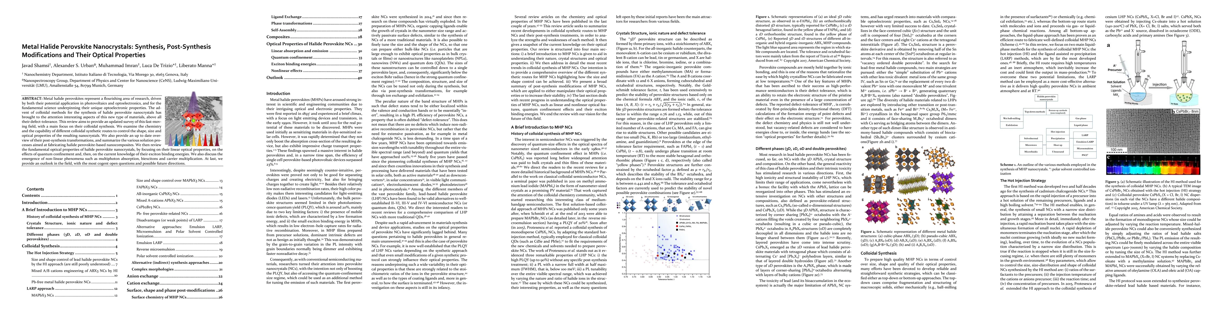 This paper reviews the synthesis and post-synthesis modifications of metal halide perovskite nanocrystals, emphasizing their colloidal synthesis and optical properties. It covers the control over nanocrystal shape, size, and optical characteristics, and discusses linear and non-linear optical phenomena, concluding with future research directions.