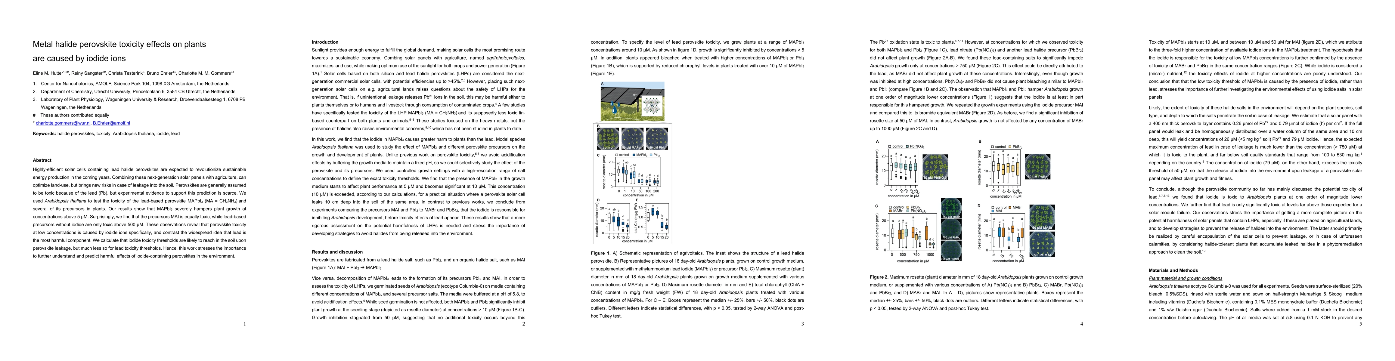 Highly-efficient solar cells containing lead halide perovskites are expected to revolutionize sustainable energy production in the coming years. Combining these next-generation solar panels with agriculture, can optimize land-use, but brings new risks in case of leakage into the soil. Perovskites are generally assumed to be toxic because of the lead (Pb), but experimental evidence to support this prediction is scarce. We used Arabidopsis thaliana to test the toxicity of the lead-based perovskite MAPbI3 (MA = CH3NH3) and several of its precursors in plants. Our results show that MAPbI3 severely hampers plant growth at concentrations above 5 microM. Surprisingly, we find that the precursors MAI is equally toxic, while lead-based precursors without iodide are only toxic above 500 microM. These observations reveal that perovskite toxicity at low concentrations is caused by iodide ions specifically, and contrast the widespread idea that lead is the most harmful component. We calculate that iodide toxicity thresholds are likely to reach in the soil upon perovskite leakage, but much less so for lead toxicity thresholds. Hence, this work stresses the importance to further understand and predict harmful effects of iodide-containing perovskites in the environment.