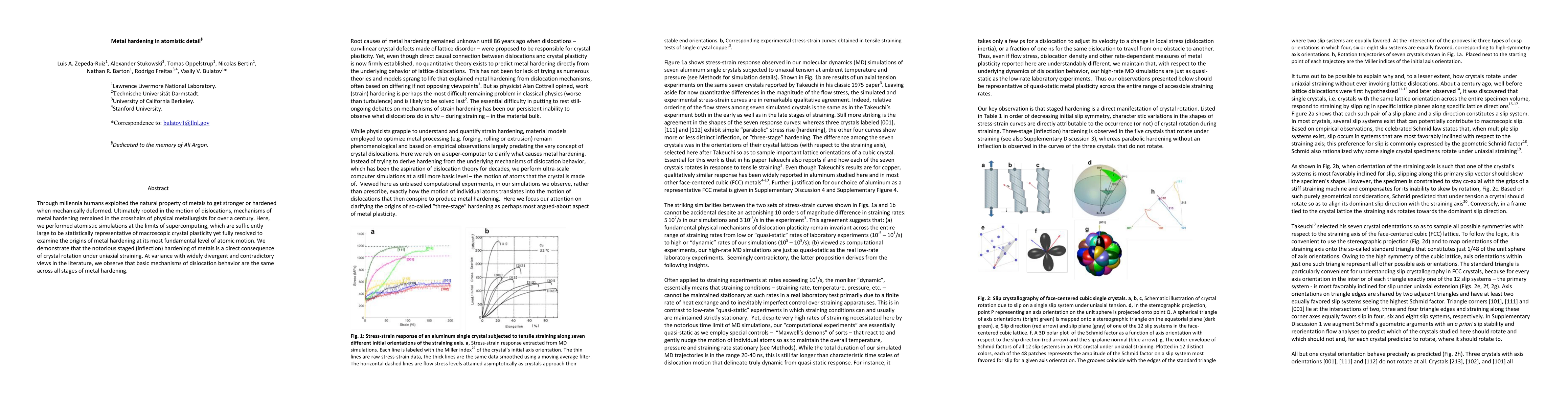 This paper uses advanced atomistic simulations to reveal the fundamental atomic mechanisms behind metal hardening, showing that staged hardening is due to crystal rotation under strain, and that dislocation behavior remains consistent across all hardening stages.