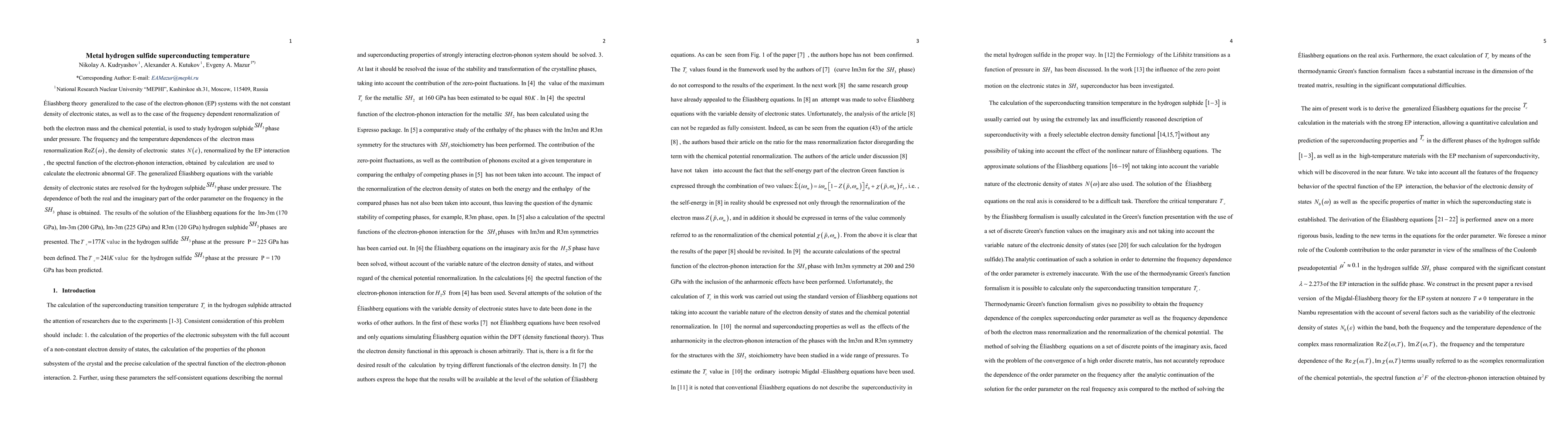 \'Eliashberg theory generalized to the case of the electron-phonon (EP) systems with the not constant density of electronic states, as well as to the case of the frequency dependent renormalization of both the electron mass and the chemical potential, is used to study hydrogen sulphide phase under pressure. The frequency and the temperature dependences of the electron mass renormalization ReZ , the density of electronic states , renormalized by the EP interaction , the spectral function of the electron-phonon interaction, obtained by calculation are used to calculate the electronic abnormal GF. The generalized \'Eliashberg equations with the variable density of electronic states are resolved for the hydrogen sulphide phase under pressure. The dependence of both the real and the imaginary part of the order parameter on the frequency in the phase is obtained. The results of the solution of the Eliashberg equations for the Im-3m (170 GPa), Im-3m (200 GPa), Im-3m (225 GPa) and R3m (120 GPa) hydrogen sulphide phases are presented. The value in the hydrogen sulfide phase at the pressure P = 225 GPa has been defined. The value for the hydrogen sulfide phase at the pressure P = 170 GPa has been predicted.