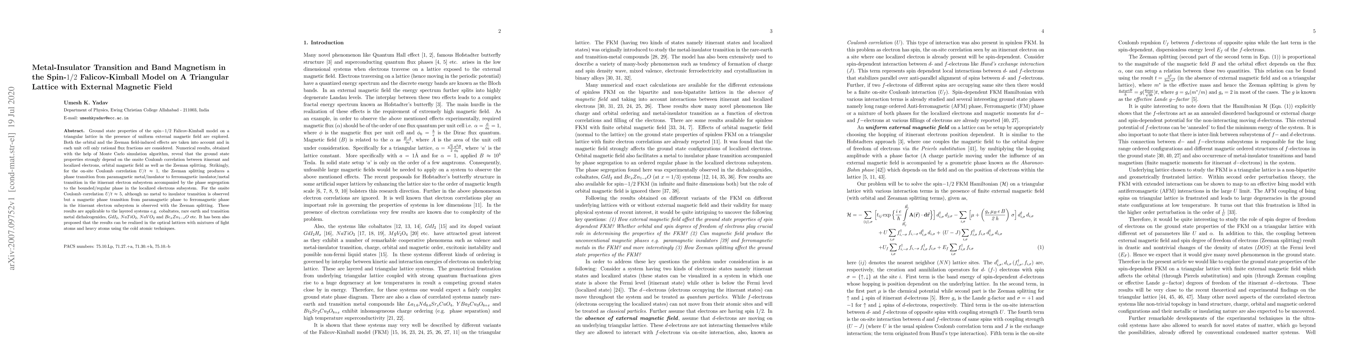 Ground state properties of the spin$-1/2$ Falicov-Kimball model on a triangular lattice in the presence of uniform external magnetic field are explored. Both the orbital and the Zeeman field-induced effects are taken into account and in each unit cell only rational flux fractions are considered. Numerical results, obtained with the help of Monte Carlo simulation algorithm, reveal that the ground state properties strongly depend on the onsite Coulomb correlation between itinerant and localized electrons, orbital magnetic field as well as the Zeeman splitting. Strikingly, for the on-site Coulomb correlation $U/t \approx 1$, the Zeeman splitting produces a phase transition from paramagnetic metal/insulator to ferromagnetic insulator/metal transition in the itinerant electron subsystem accompanied by the phase segregation to the bounded/regular phase in the localized electrons subsystem. For the onsite Coulomb correlation $U/t \approx 5$, although no metal to insulator transition is observed but a magnetic phase transition from paramagnetic phase to ferromagnetic phase in the itinerant electron subsystem is observed with the Zeeman splitting. These results are applicable to the layered systems e.g. cobaltates, rare earth and transition metal dichalcogenides, $GdI_{2}$, $NaTiO_{2}$, $NaVO_{2}$ and $Be_{x}Zn_{1-x}O$ etc. It has been also proposed that the results can be realized in the optical lattices with mixtures of light atoms and heavy atoms using the cold atomic techniques.