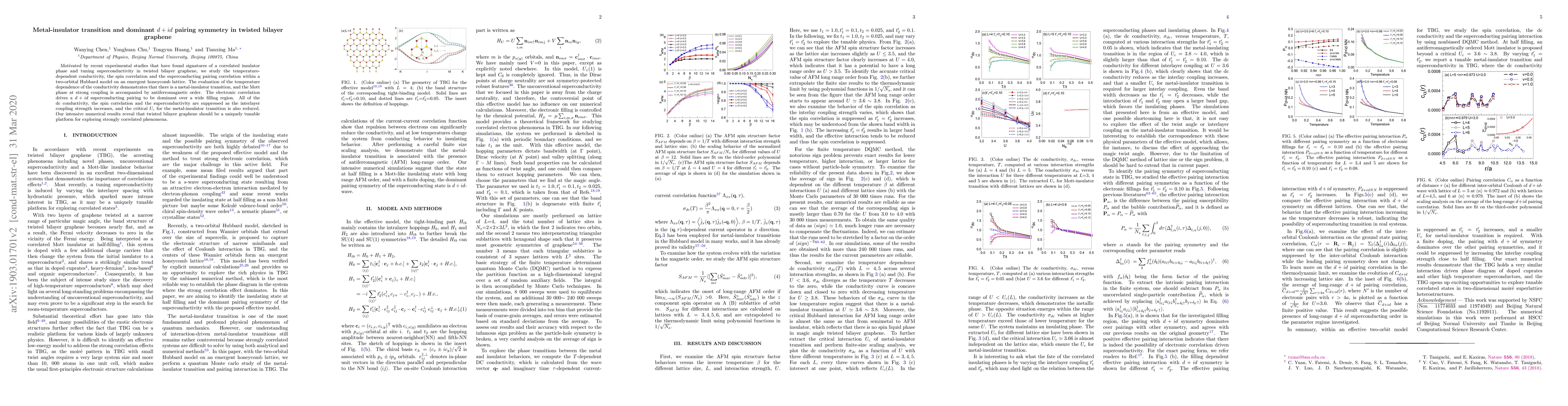 Motivated by recent experimental studies that have found signatures of a correlated insulator phase and tuning superconductivity in twisted bilayer graphene, we study the temperature-dependent conductivity, the spin correlation and the superconducting pairing correlation within a two-orbital Hubbard model on an emergent honeycomb lattice. The evaluation of the temperature dependence of the conductivity demonstrates that there is a metal-insulator transition, and the Mott phase at strong coupling is accompanied by antiferromagnetic order. The electronic correlation drives a $d+id$ superconducting pairing to be dominant over a wide filling region. All of the dc conductivity, the spin correlation and the superconductivity are suppressed as the interlayer coupling strength increases, and the critical $U_c$ for the metal-insulator transition is also reduced. Our intensive numerical results reveal that twisted bilayer graphene should be a uniquely tunable platform for exploring strongly correlated phenomena.