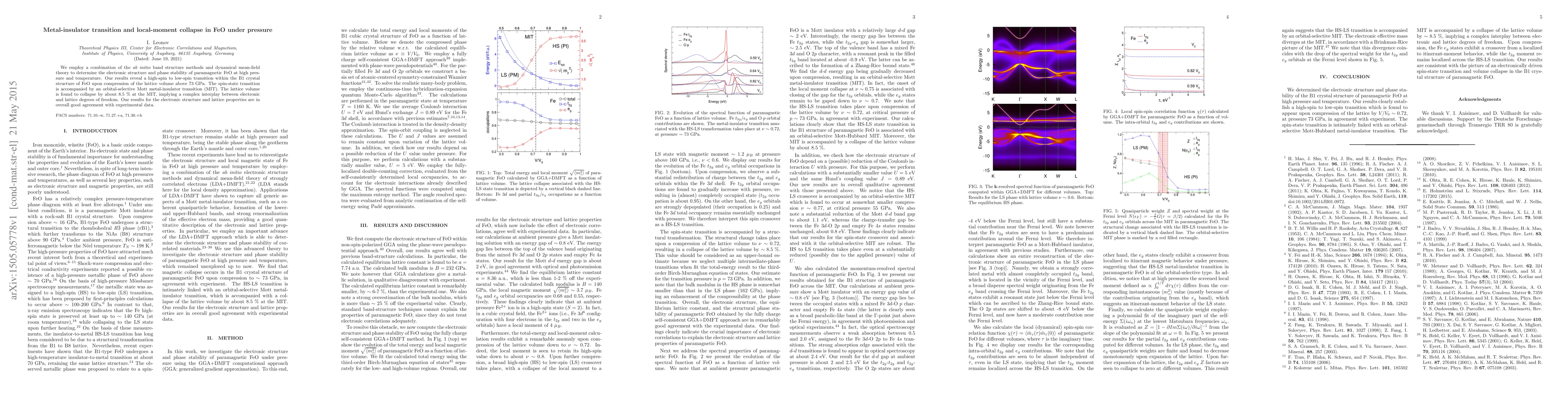 This paper investigates the electronic structure of FeO under high pressure using \emph{ab initio} methods and dynamical mean-field theory, revealing a high-spin to low-spin transition and an orbital-selective Mott metal-insulator transition at pressures above 73 GPa, accompanied by a significant lattice collapse of about 8.5%.