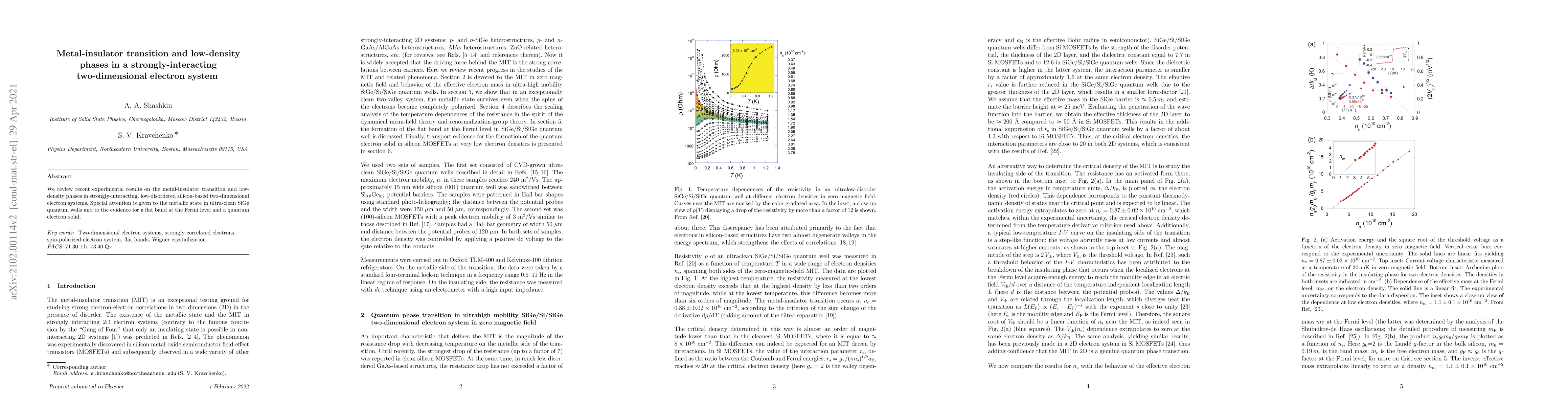 We review recent experimental results on the metal-insulator transition and low-density phases in strongly-interacting, low-disordered Si-based two-dimensional electron systems. Special attention is given to the metallic state in ultra-clean SiGe quantum wells and to the evidence for a flat band at the Fermi level and a quantum electron solid.