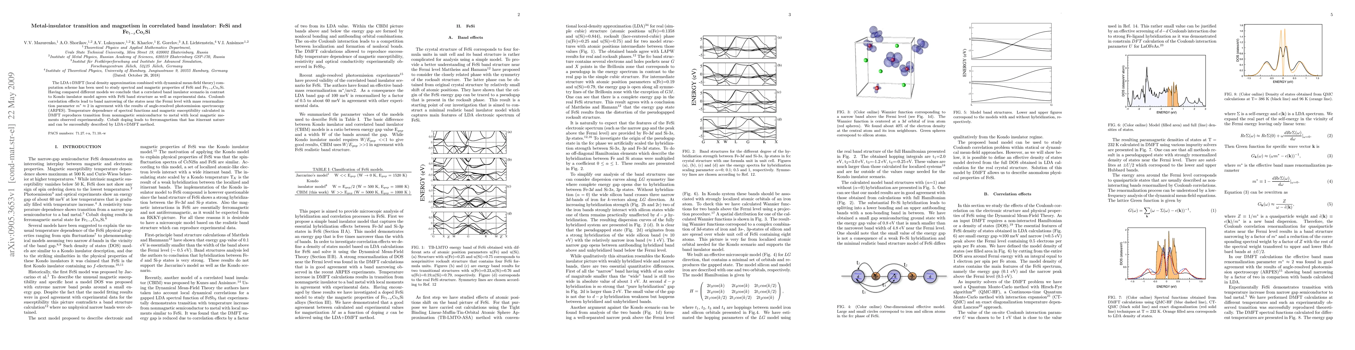 The LDA+DMFT (local density approximation combined with dynamical mean-field theory) computation scheme has been used to study spectral and magnetic properties of FeSi and Fe$_{1-x}$Co$_{x}$Si. Having compared different models we conclude that a correlated band insulator scenario in contrast to Kondo insulator model agrees with FeSi band structure as well as experimental data. Coulomb correlation effects lead to band narrowing of the states near the Fermi level with mass renormalization parameter $m^*\approx 2$ in agreement with the results of angle-resolved photoemission spectroscopy (ARPES). Temperature dependence of spectral functions and magnetic susceptibility calculated in DMFT reproduces transition from nonmagnetic semiconductor to metal with local magnetic moments observed experimentally. Cobalt doping leads to ferromagnetism that has itinerant nature and can be successfully described by LDA+DMFT method.