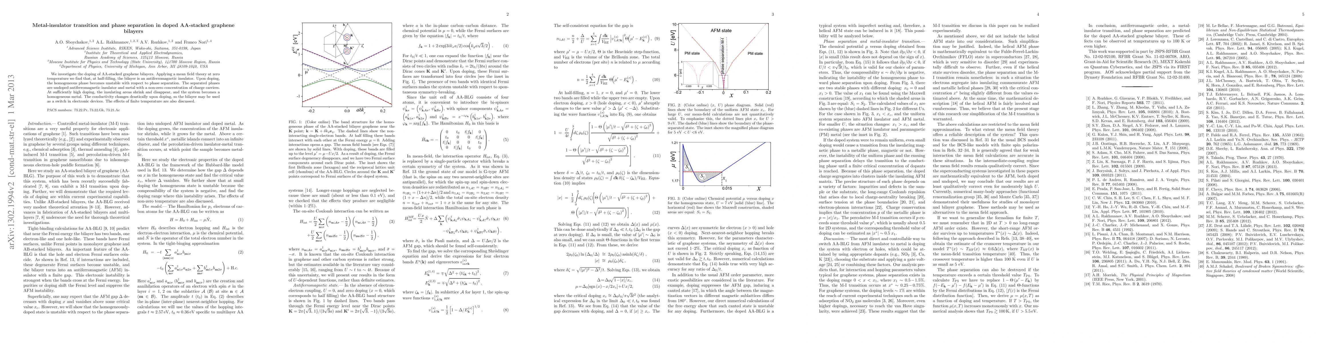 The research explores the metal-insulator transition in doped AA-stacked graphene bilayers, revealing that phase separation occurs upon doping, leading to an antiferromagnetic insulating phase and a metallic phase. High doping eliminates insulating regions, making the bilayer suitable for use in electronic devices as a conductivity switch.