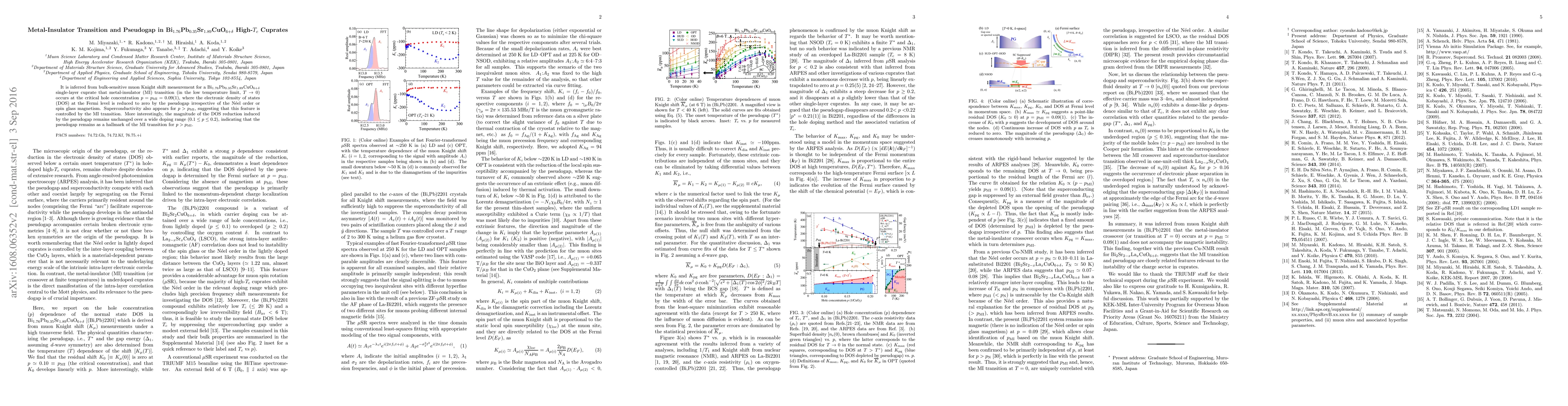 This study reveals a metal-insulator transition in Bi$_{1.76}$Pb$_{0.35}$Sr$_{1.89}$CuO$_{6+\delta}$ high-$T_c$ cuprates at a critical hole concentration of $p_{\rm MI}=0.09(1)$, where the pseudogap eliminates the electronic density of states at the Fermi level. The pseudogap's effect persists across a wide doping range, indicating its role in the MI transition and superconductivity.