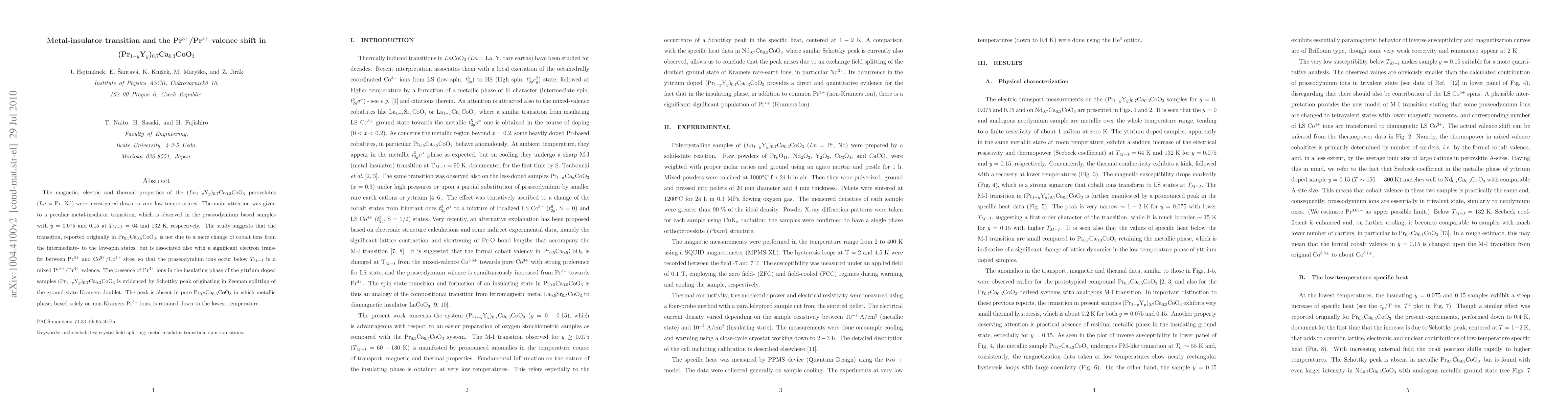 This study investigates the metal-insulator transition in praseodymium-based perovskites, revealing that the transition is linked to a Pr$^{3+}$/Pr$^{4+}$ valence shift rather than just cobalt spin state changes. Evidence of Pr$^{4+}$ ions in the insulating phase is provided by a Schottky peak, indicating electron transfer between Pr and Co sites.