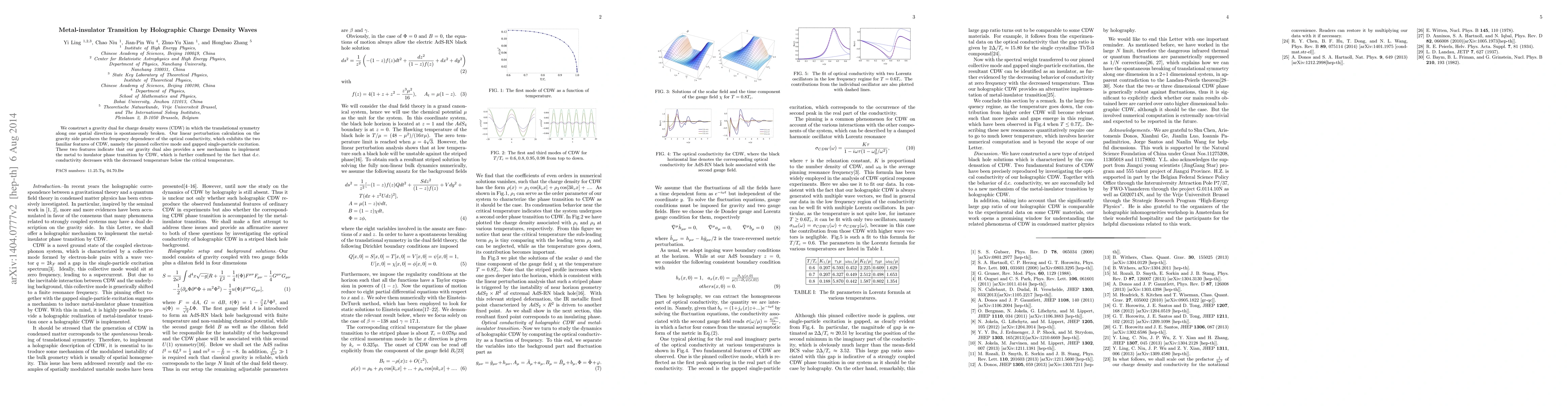 This paper constructs a gravity dual for charge density waves (CDW) that breaks translational symmetry, revealing the pinned collective mode and gapped single-particle excitation in optical conductivity. The findings suggest a new mechanism for metal-insulator transitions via CDW, confirmed by decreasing d.c. conductivity with temperature below the critical point.