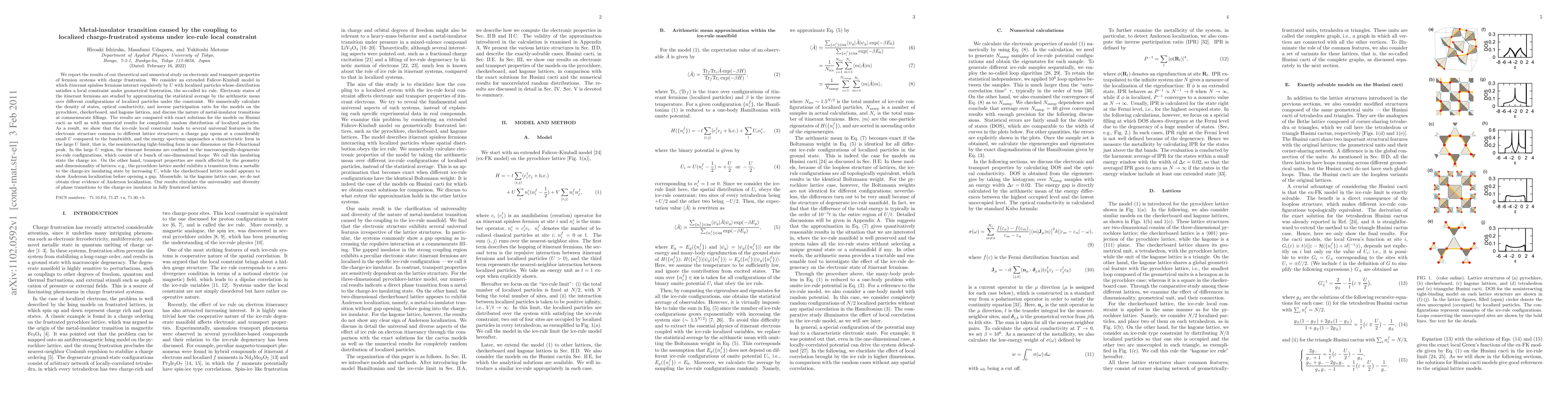 This study investigates the metal-insulator transition in fermion systems with charge frustration under an ice-rule local constraint using the extended Falicov-Kimball model. The research reveals that the transition leads to a charge-ice insulating state characterized by a charge gap and unique energy spectrum features, with transport properties varying significantly across different lattice geometries.