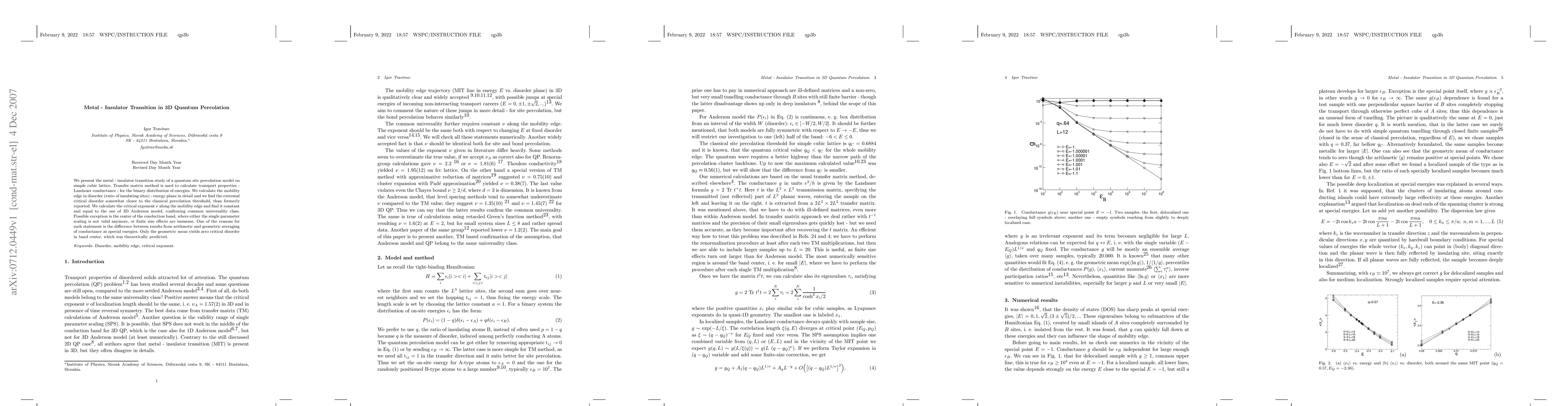 This study investigates how electrons transition between conducting and insulating states in a 3D quantum percolation model, using transfer matrix calculations to identify critical disorder levels and confirming that this transition shares universal properties with other known models. Key findings include the close match of the critical behavior to the 3D Anderson model and insights into how averaging methods affect understanding of conduction at the band center.