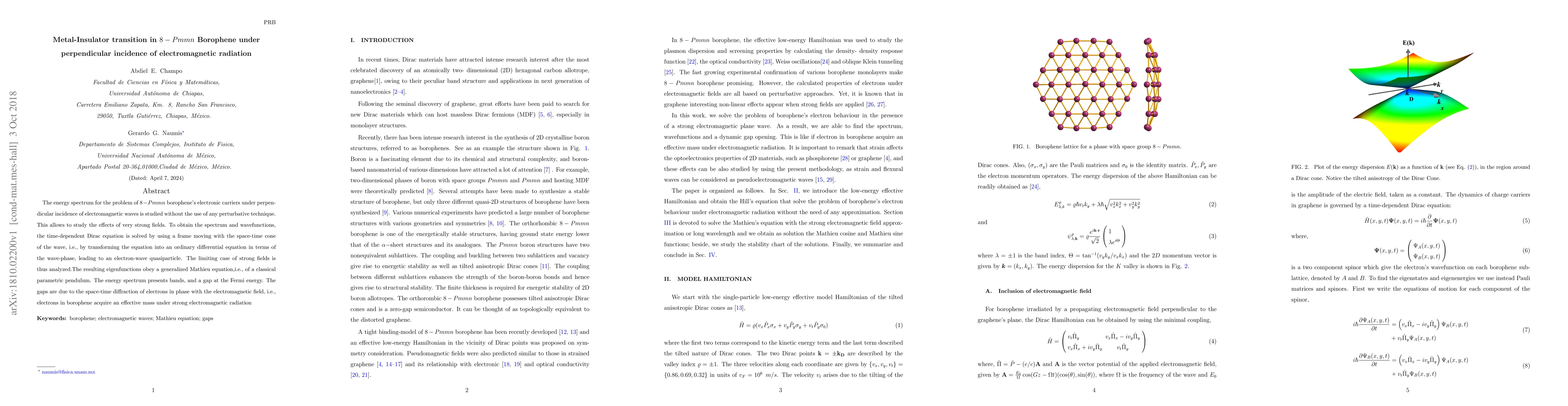 The energy spectrum for the problem of 8-Pmmn borophene's electronic carriers under perpendicular incidence of electromagnetic waves is studied without the use of any perturbative technique. This allows to study the effects of very strong fields. To obtain the spectrum and wavefunctions, the time-dependent Dirac equation is solved by using a frame moving with the space-time cone of the wave, i.e., by transforming the equation into an ordinary differential equation in terms of the wave-phase, leading to an electron-wave quasiparticle. The limiting case of strong fields is thus analyzed.The resulting eigenfunctions obey a generalized Mathieu equation,i.e., of a classical parametric pendulum. The energy spectrum presents bands, and a gap at the Fermi energy. The gaps are due to the space-time diffraction of electrons in phase with the electromagnetic field, i.e., electrons in borophene acquire an effective mass under strong electromagnetic radiation