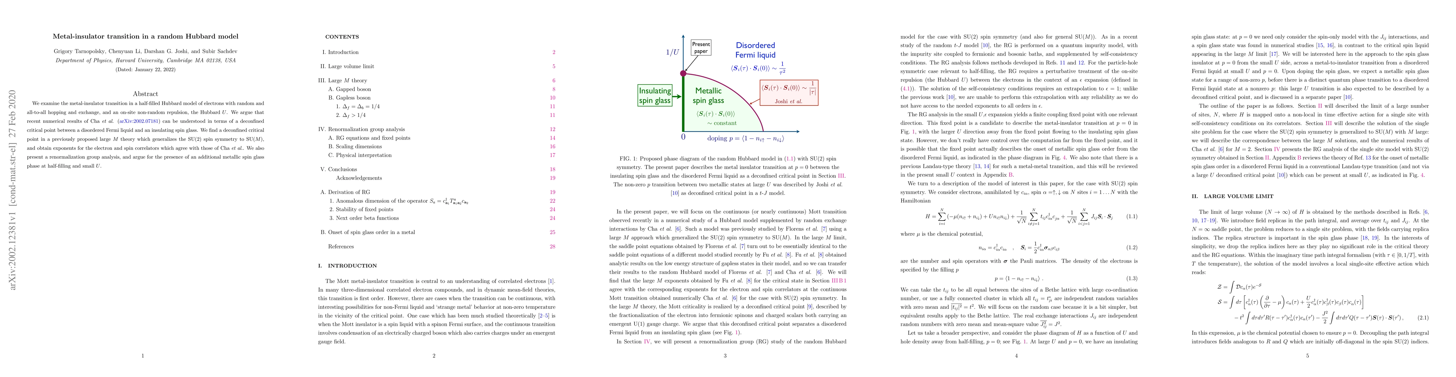 We examine the metal-insulator transition in a half-filled Hubbard model of electrons with random and all-to-all hopping and exchange, and an on-site non-random repulsion, the Hubbard $U$. We argue that recent numerical results of Cha et al. (arXiv:2002.07181) can be understood in terms of a deconfined critical point between a disordered Fermi liquid and an insulating spin glass. We find a deconfined critical point in a previously proposed large $M$ theory which generalizes the SU(2) spin symmetry to SU($M$), and obtain exponents for the electron and spin correlators which agree with those of Cha et al. We also present a renormalization group analysis, and argue for the presence of an additional metallic spin glass phase at half-filling and small $U$.