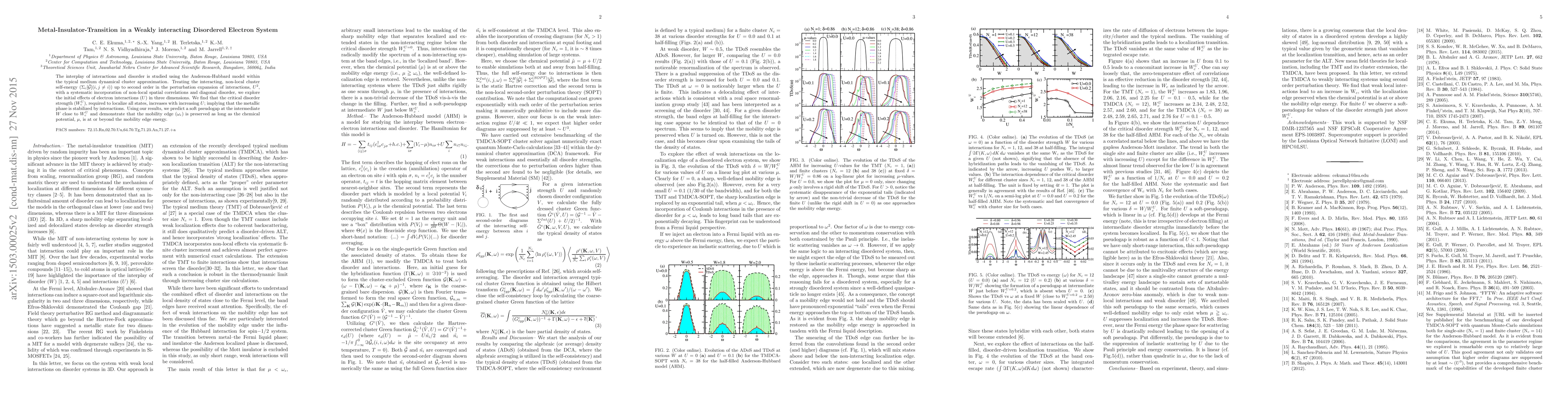 The interplay of interactions and disorder is studied using the Anderson-Hubbard model within the typical medium dynamical cluster approximation. Treating the interacting, non-local cluster self-energy ($\Sigma_c[{\cal \tilde{G}}](i,j\neq i)$) up to second order in the perturbation expansion of interactions, $U^2$, with a systematic incorporation of non-local spatial correlations and diagonal disorder, we explore the initial effects of electron interactions ($U$) in three dimensions. We find that the critical disorder strength ($W_c^U$), required to localize all states, increases with increasing $U$; implying that the metallic phase is stabilized by interactions. Using our results, we predict a soft pseudogap at the intermediate $W$ close to $W_c^U$ and demonstrate that the mobility edge ($\omega_\epsilon$) is preserved as long as the chemical potential, $\mu$, is at or beyond the mobility edge energy.