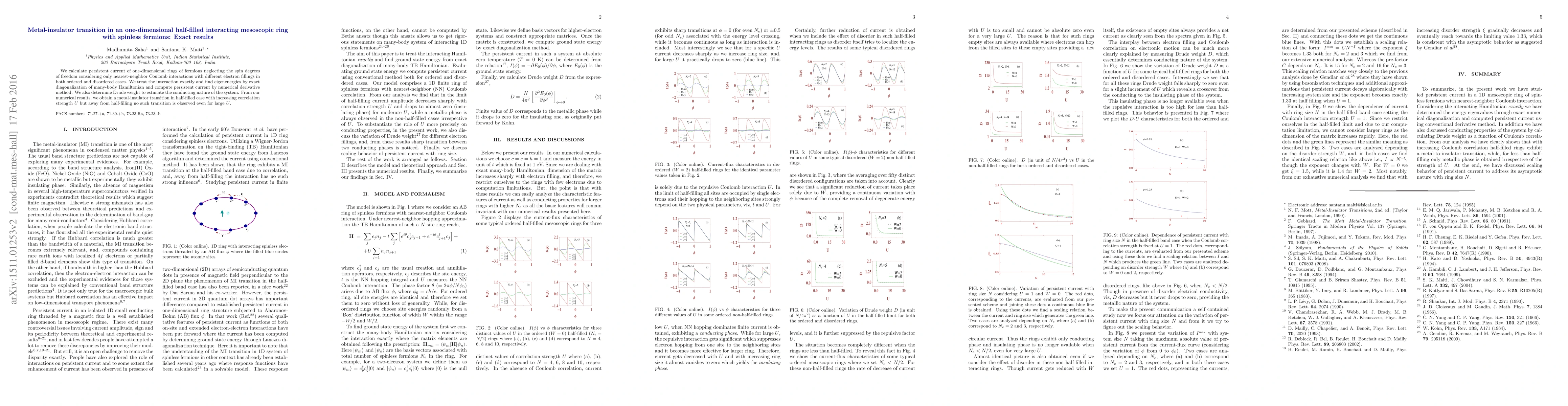 We calculate persistent current of one-dimensional rings of fermions neglecting the spin degrees of freedom considering only nearest-neighbor Coulomb interactions with different electron fillings in both ordered and disordered cases. We treat the interaction exactly and find eigenenergies by exact diagonalization of many-body Hamiltonian and compute persistent current by numerical derivative method. We also determine Drude weight to estimate the conducting nature of the system. From our numerical results, we obtain a metal-insulator transition in half-filled case with increasing correlation strength U but away from half-filling no such transition is observed even for large U.