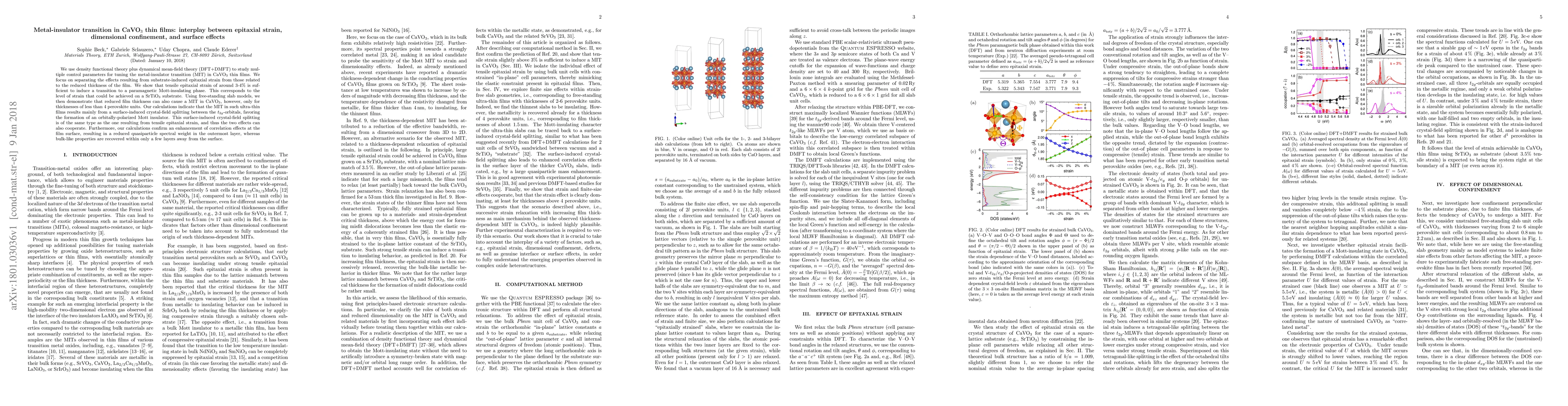 We use density functional theory plus dynamical mean-field theory (DFT+DMFT) to study multiple control parameters for tuning the metal-insulator transition (MIT) in CaVO$_3$ thin films. We focus on separating the effects resulting from substrate-induced epitaxial strain from those related to the reduced thickness of the film. We show that tensile epitaxial strain of around 3-4% is sufficient to induce a transition to a paramagnetic Mott-insulating phase. This corresponds to the level of strain that could be achieved on a SrTiO$_3$ substrate. Using free-standing slab models, we then demonstrate that reduced film thickness can also cause a MIT in CaVO$_3$, however, only for thicknesses of less than 4 perovskite units. Our calculations indicate that the MIT in such ultra-thin films results mainly from a surface-induced crystal-field splitting between the $t_{2g}$-orbitals, favoring the formation of an orbitally-polarized Mott insulator. This surface-induced crystal-field splitting is of the same type as the one resulting from tensile epitaxial strain, and thus the two effects can also cooperate. Furthermore, our calculations confirm an enhancement of correlation effects at the film surface, resulting in a reduced quasiparticle spectral weight in the outermost layer, whereas bulk-like properties are recovered within only a few layers away from the surface.
